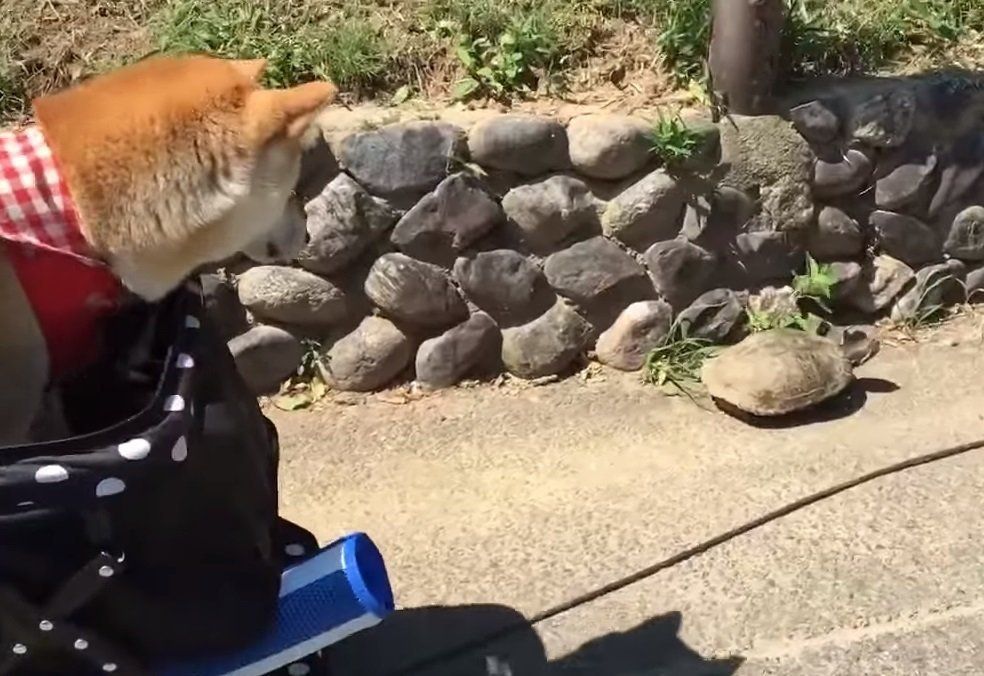 怖いけど気になるワン! マイペースに歩く亀の動きに警戒する柴犬