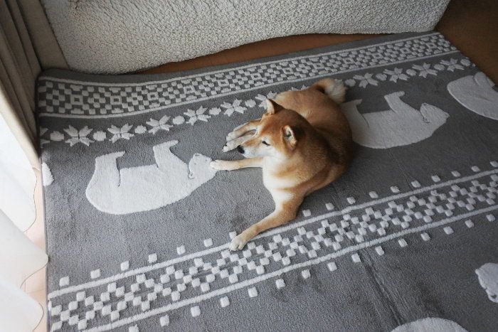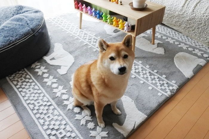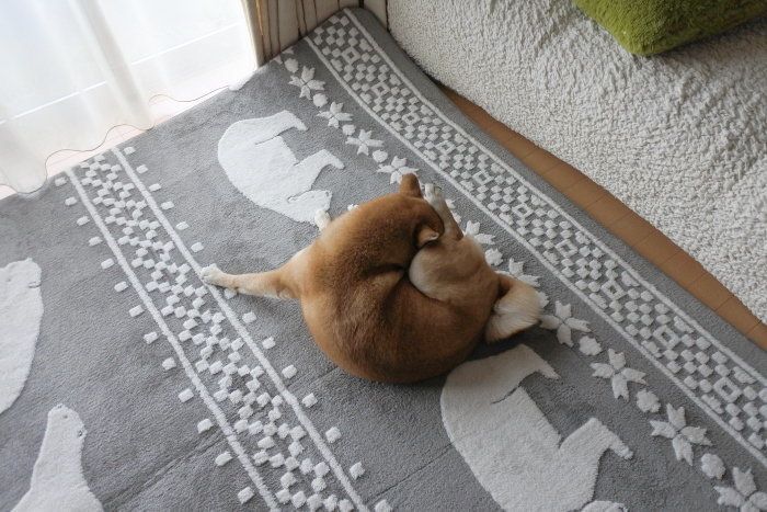我が家のラグ選びは、デザインよりもマロたんが気にいるかどうかが重要です。お昼寝したり、おやつを食べたり、日中の多くを過ごす場所なので、マロたんの好みを最優先。ふかふかで柔らかくてふわふわのラグ、あっさりニトリで発見。白くまさん可愛い。