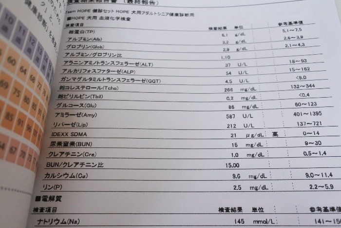 一箇所を除き、基準値に収まっていました。甲状腺も異常なし。しかし、SDMAと言う項目だけ高いです。今まで腎臓の病気は、ある程度病状が進まないと調べることが出来なかったそうですが、このSDMAを検査することにより早期発見出来るようになったそうです。