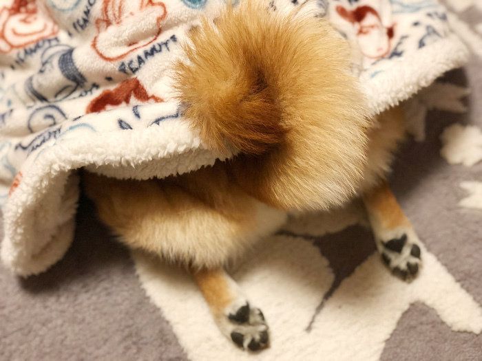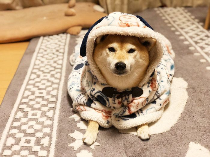 おうちの中でもわんこ用着る毛布でぽかぽかです。要らないかも…と思いつつ、絶対に可愛いだろうなとポチってしまいました。若干獅子舞ぽい気もしますが、それはそれで可愛いです。