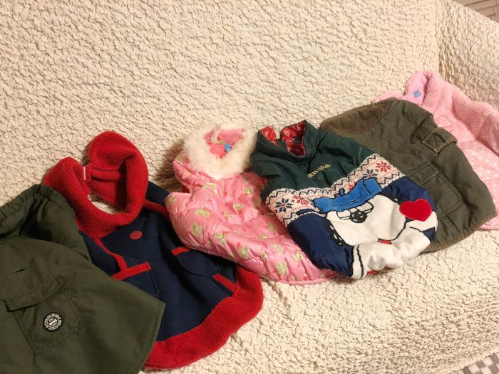 お散歩用の洋服を出しただけの冬支度。まだ出してないのもありますが、これだけあれば当分なんとかなるでしょう。特に一番左のは、ハーネス用の穴があるので便利です。首輪用のがあるのはたくさんありますが、ハーネスを着けてリードを装着できるのってなかなか無いんです。ちなみにアメリカのブランドのものです。