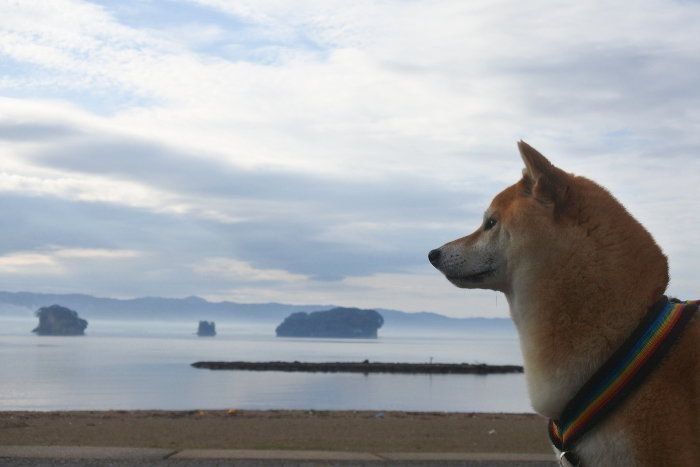 マロたんも飼い主もコートがいらない12月の奥能登の海岸です。母と「10月ぐらいに感じるね」と話しながら青空の珠洲を進みます。