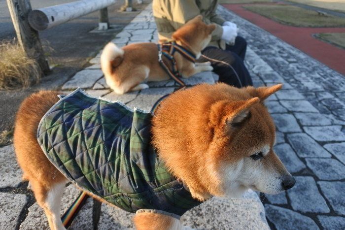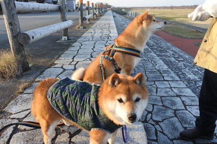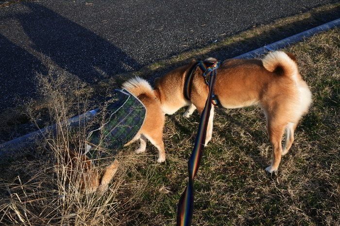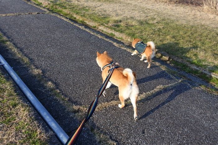 そんな「ふたり」がぽかぽか陽気に誘われて、久しぶりに並んで歩きました。体は小さくとも4歳年上のヤマトくんが先に歩くのが流儀なのか、一歩下がって歩く大和撫子なマロたんです。