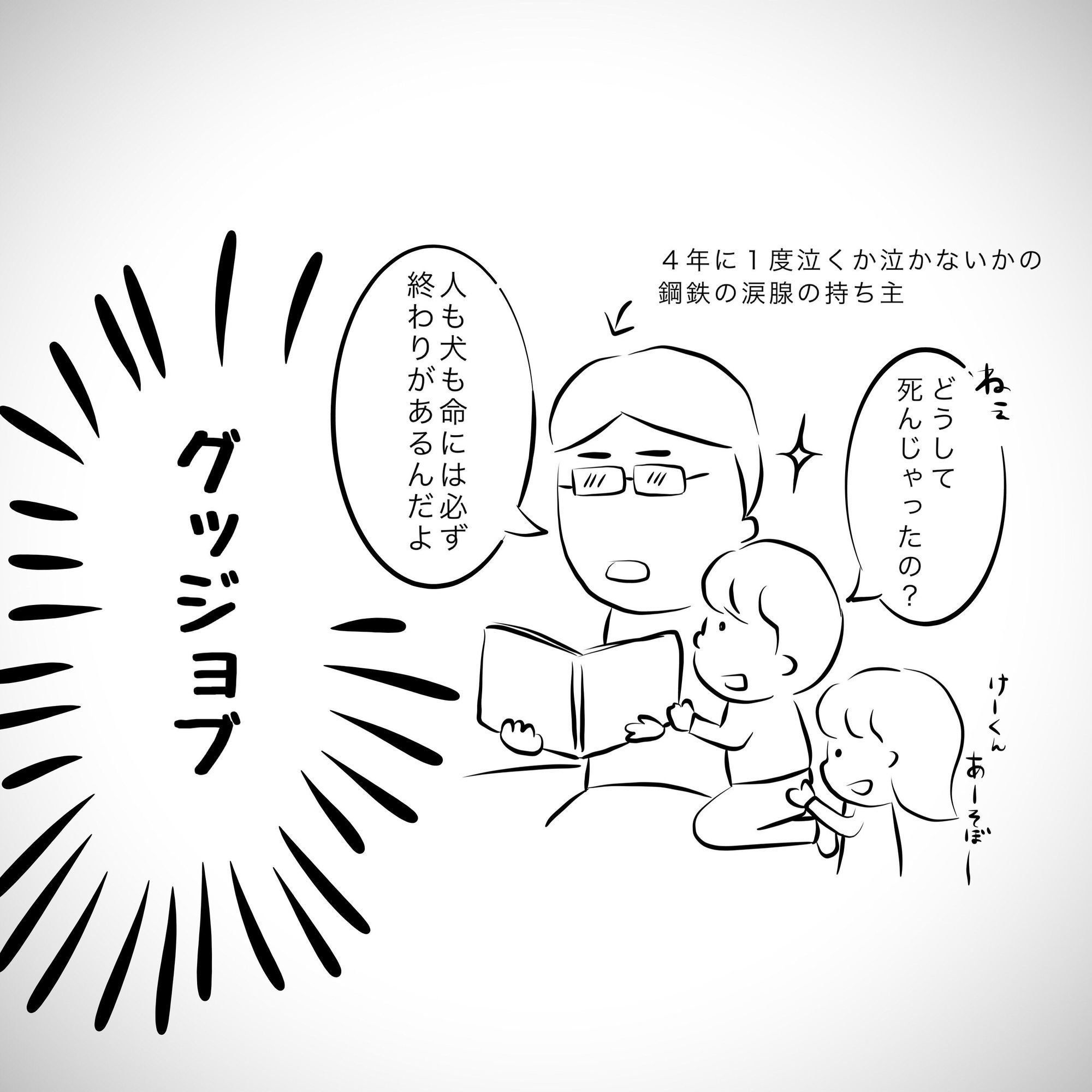 パパにナレーターチェンジしたことでようやく「なんで死んじゃったの?」「死んだら何処にいくの?」と、子どもたちもお話に集中することができた様子。