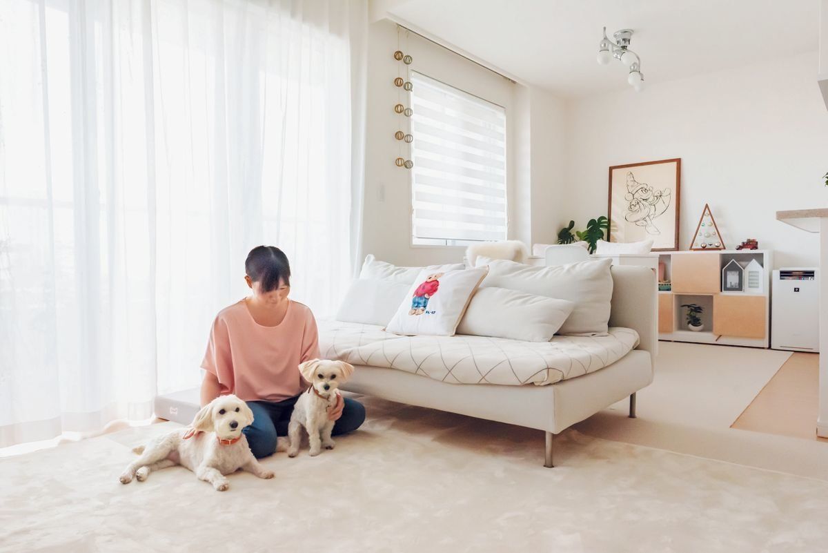 「インテリアにこだわるようになったのは、このマンションに入居してから。全体は白を基調とした北欧風にまとめ、愛犬たちのグッズもインテリアに合うナチュラルな色でそろえています」