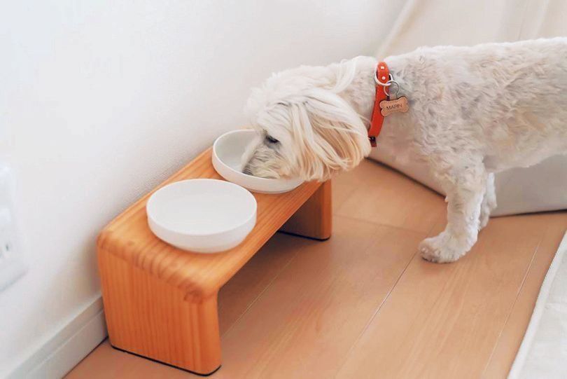 ハンドメイドアプリ「ミンネ」で見つけたフード&水飲み台を愛用。「負担にならない高さのものを探していたのですが、斜めなので飲みやすいみたいです」