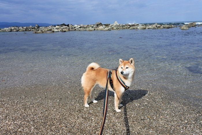 海水の透明度が素晴らしい。以前のマロたんが足が少しでも濡れるのを嫌がったのに、今では少し水の中に入っても大丈夫になりました。年を取るのも悪いことばかりではありませんね。