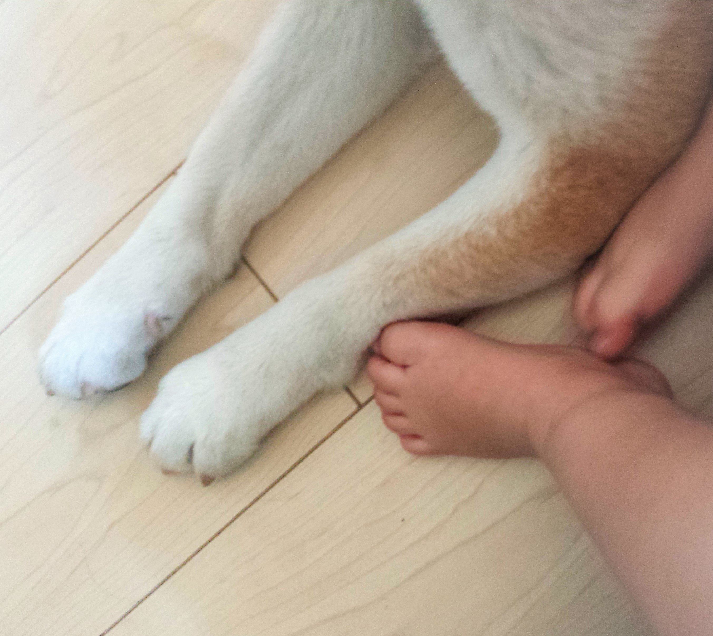 タロさんにくっつくのをやめた娘でしたが、まだ素足でタロさんの足を軽く触っていました。
