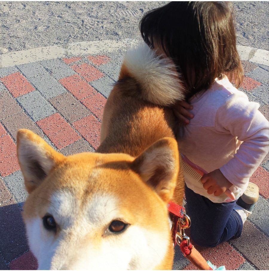肌全体でタロさんのモフモフを感じたのでしょうか、くっついた途端、笑顔の娘!