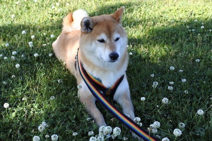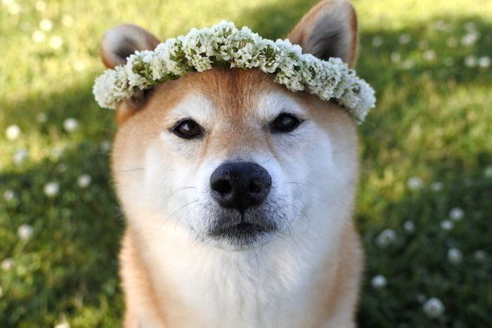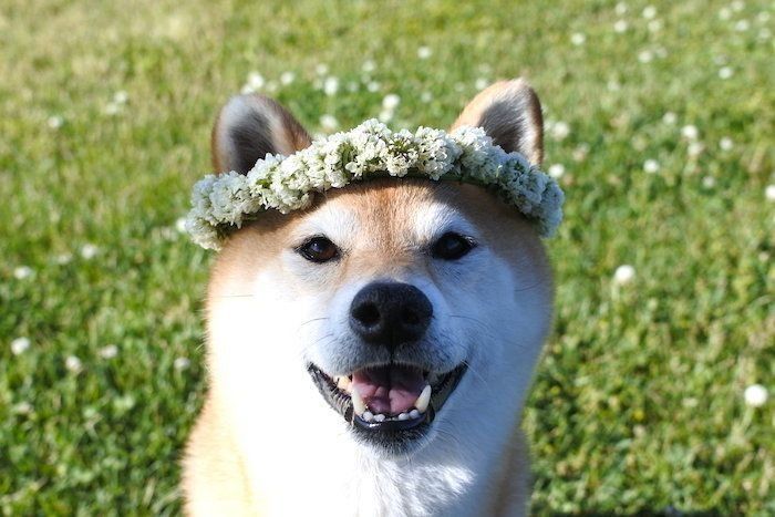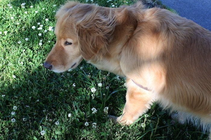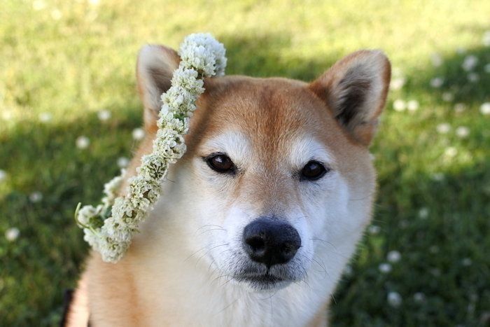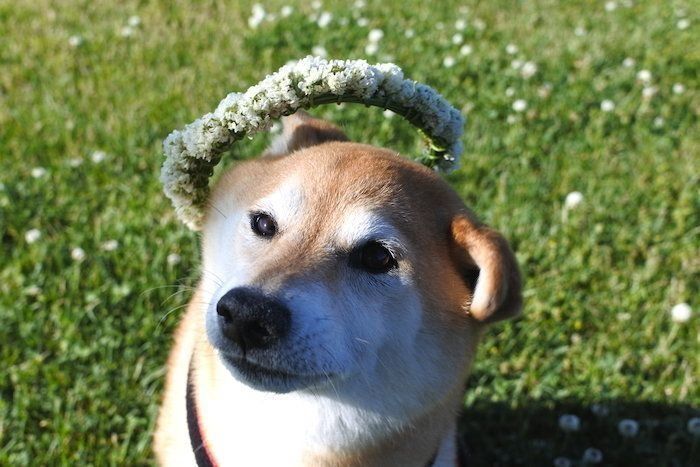 たくさん咲いているシロツメクサで花冠を作りました。マロたんにぴったりサイズ。「似合ってるよ!」「可愛いよ!」と、褒めに褒めながら写真を撮っていたのですが、マロたん的には迷惑だったようです。