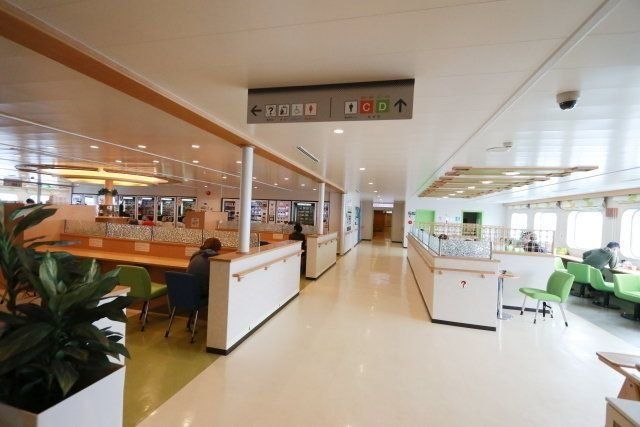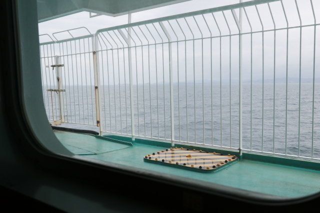 音に敏感な大吉はそれが嫌なようだった。ずっと落ち着きなくハァハァと動き回っている。さらに座っているとあまりわからなかったが、歩いて船内を移動すると、ときどき「おっとっと」とよろめくほど揺れる。何かに捕まらないといけないほどではないが、低気圧による波の影響なのだろう。車は平気な大吉も、船の揺れは嫌なようだ。