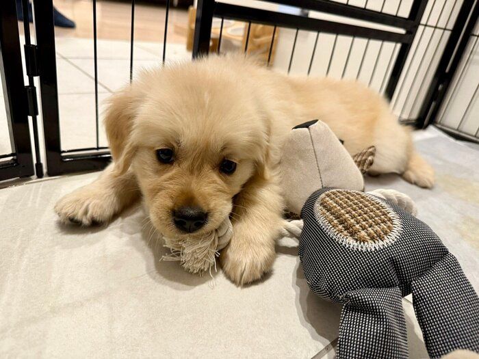 紹介するのは、X(旧Twitter)ユーザー@tkkrtm0w0さんの愛犬・えるちゃん(取材時1才/ゴールデン・レトリバー)。こちらは、飼い主さんのおうちに来た記念として撮影した1枚だそうです。当時のことを振り返り、飼い主さんは次のように話してくれました。