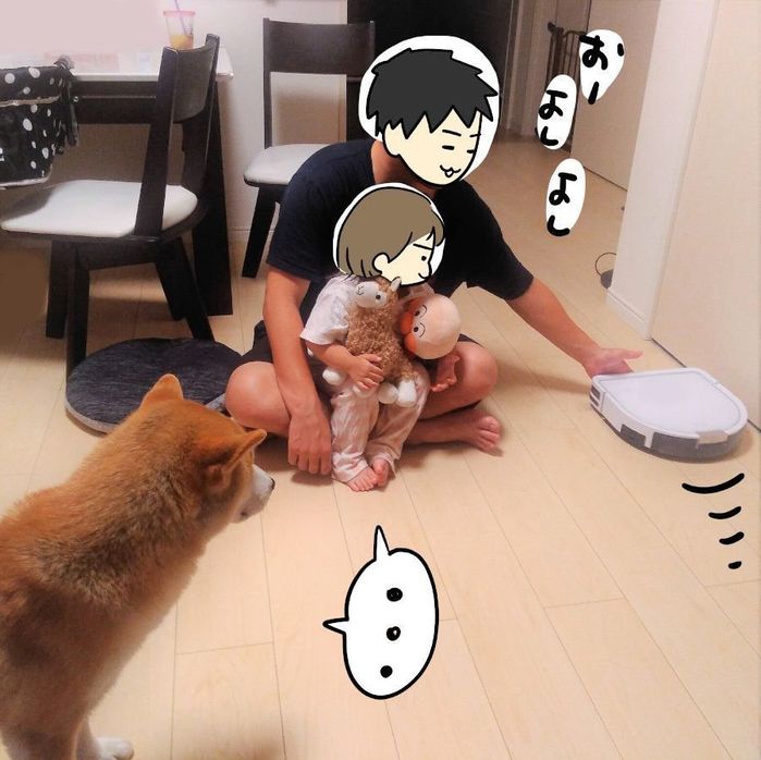 パパが一生懸命「怖くないよ~」と言いながらお掃除ロボを撫でて仲良しアピールをしています(笑)