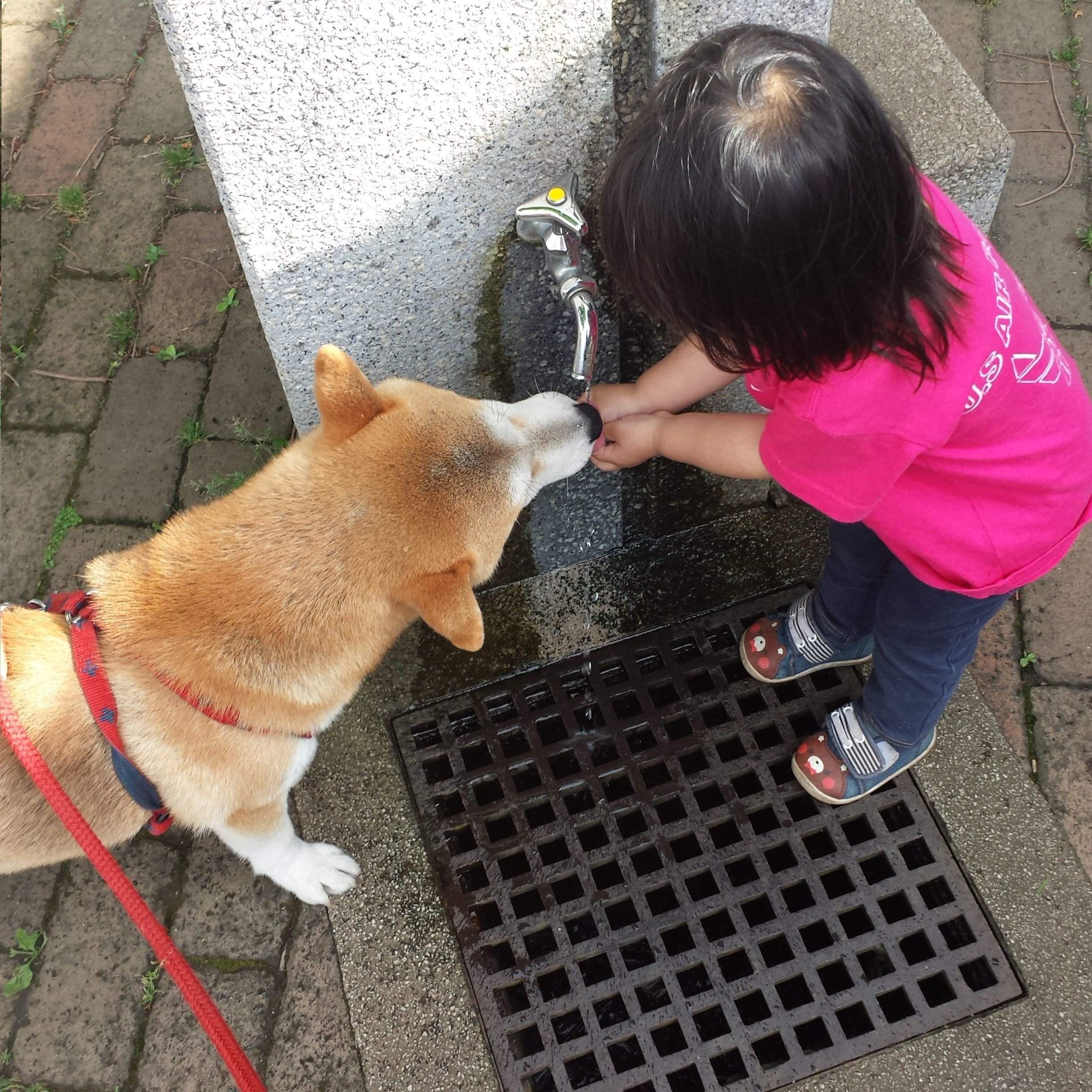 公園の水道で、娘が手で器を作ってタロさんに飲ませてあげます。