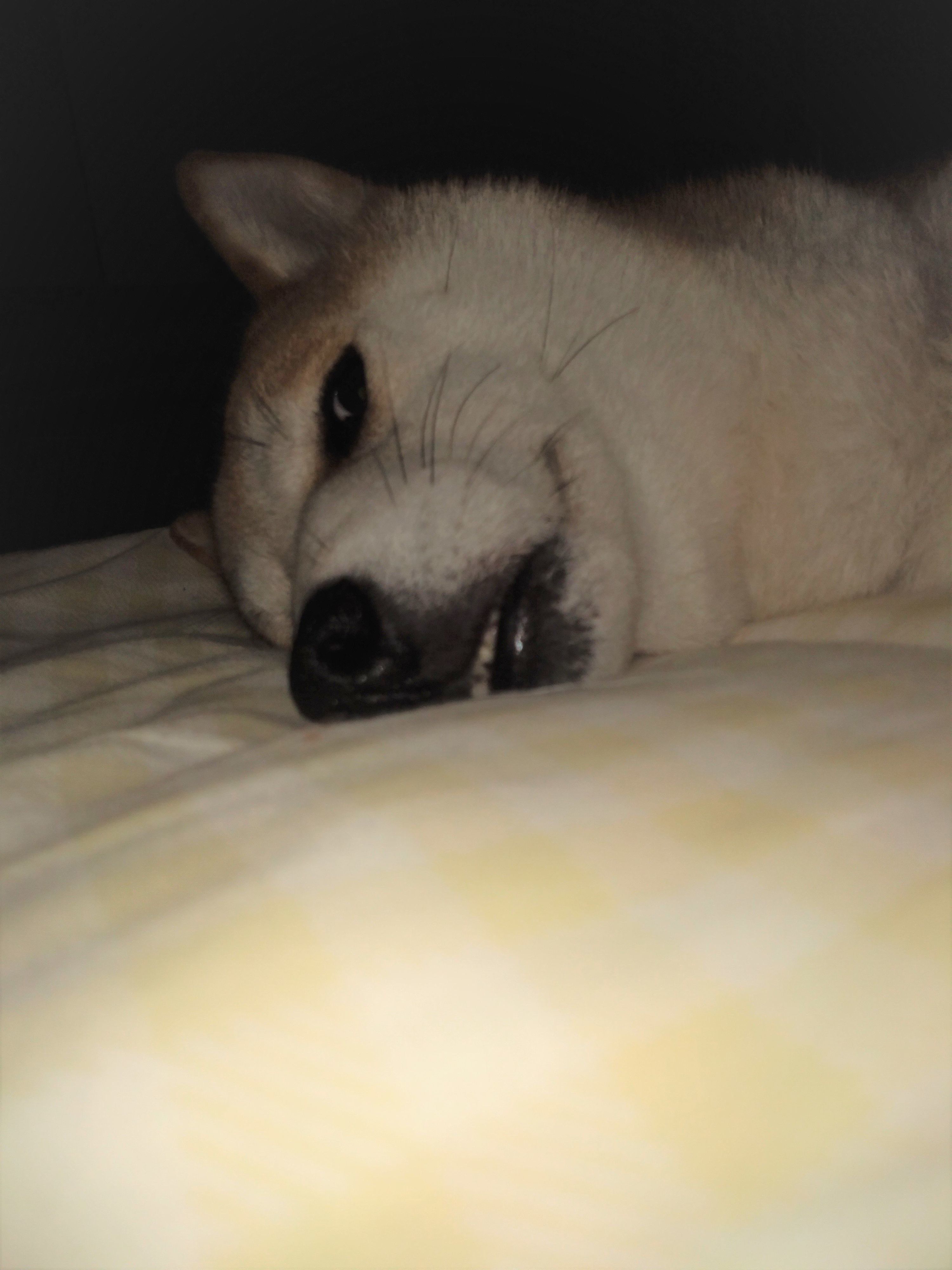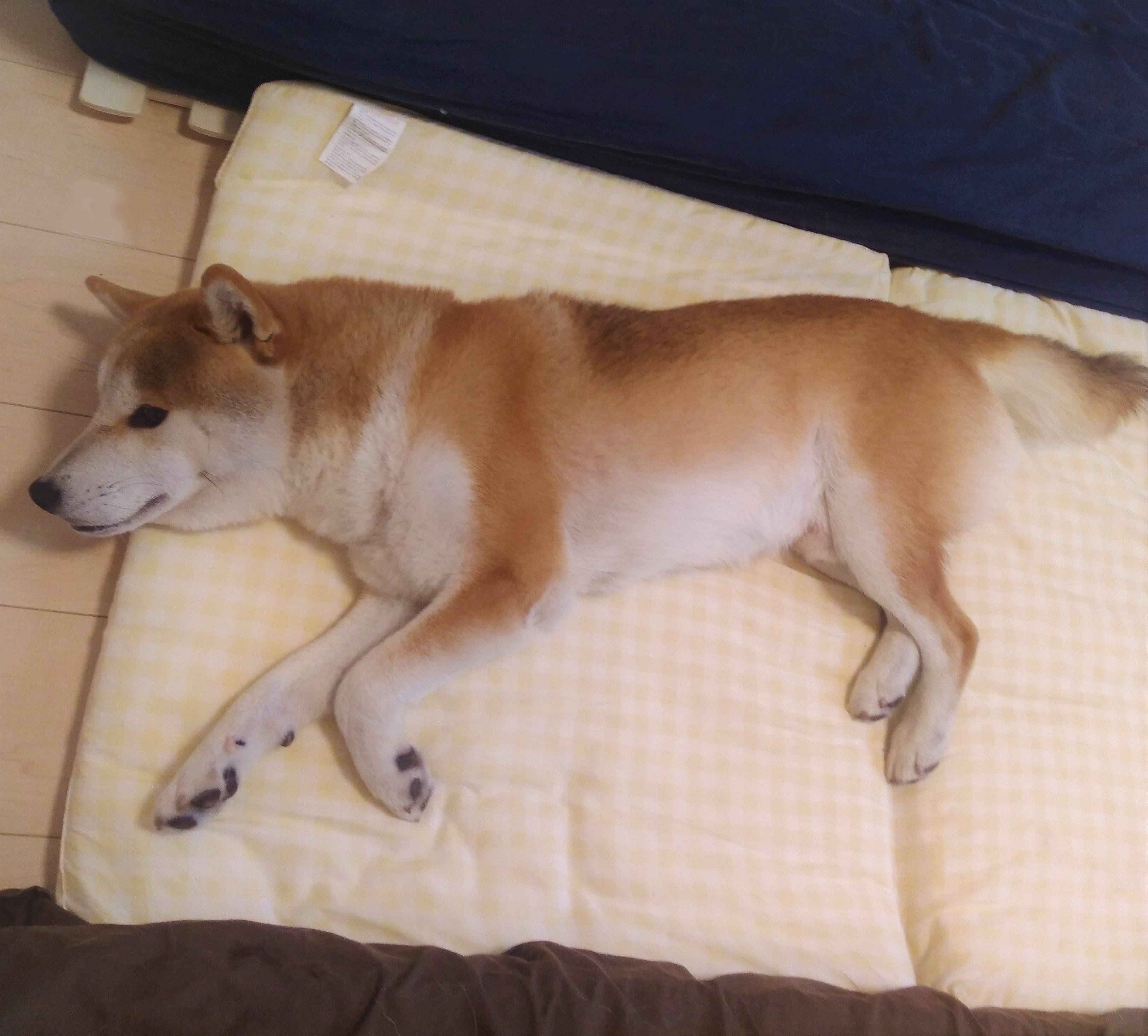 タロさんは寝るとき、いつも自分の小屋で寝ていますが夏の暑くて寝苦しい夜は、クーラーのついている寝室に来てみんなと一緒に寝ています。
