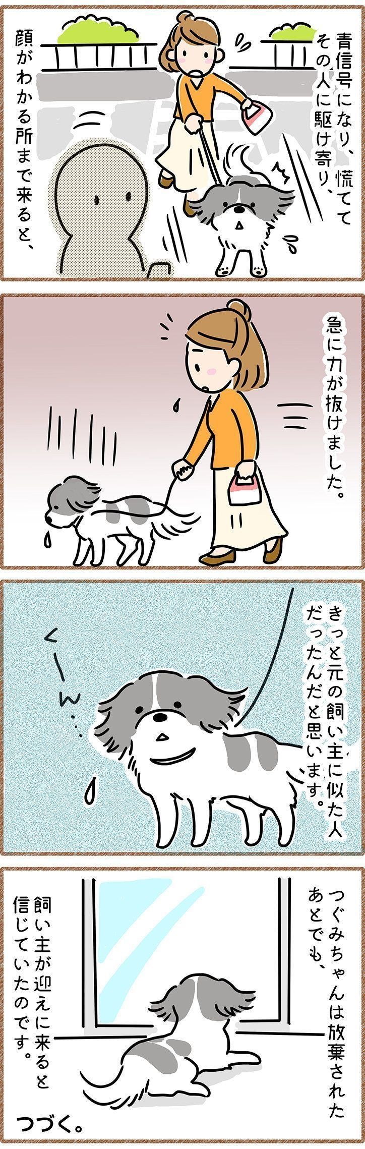 もしかして、今の人はつぐみちゃんを捨てた飼い主に似ていたんじゃないだろうか。つぐみちゃんは、今でも飼い主が迎えに来てくれると信じているのだと。