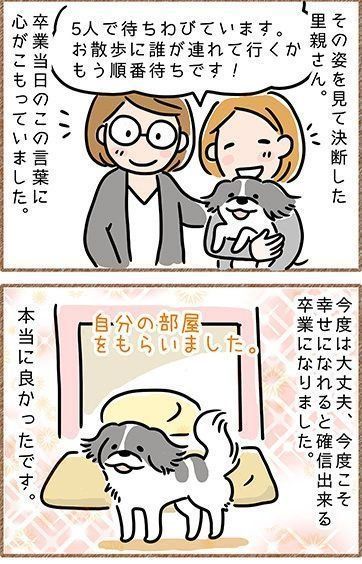 そして迎えた卒業当日、娘さんとお母さんでつぐみちゃんを愛おしそうに抱っこし、みんな大喜びで待っていると、一緒に帰ろうねと笑顔で卒業していきました。