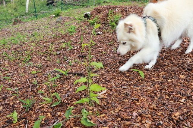 プライベートドッグランの歩み」に完結編と書いたが、全然終わっていなかった。すぐに雑草が生えてくるのだ。拡張した部分が顕著で、広げた部分がわかるほどそこだけ雑草がムクムク育ってくる。2週間前に草刈りしたばかりなのに、こんな状態。