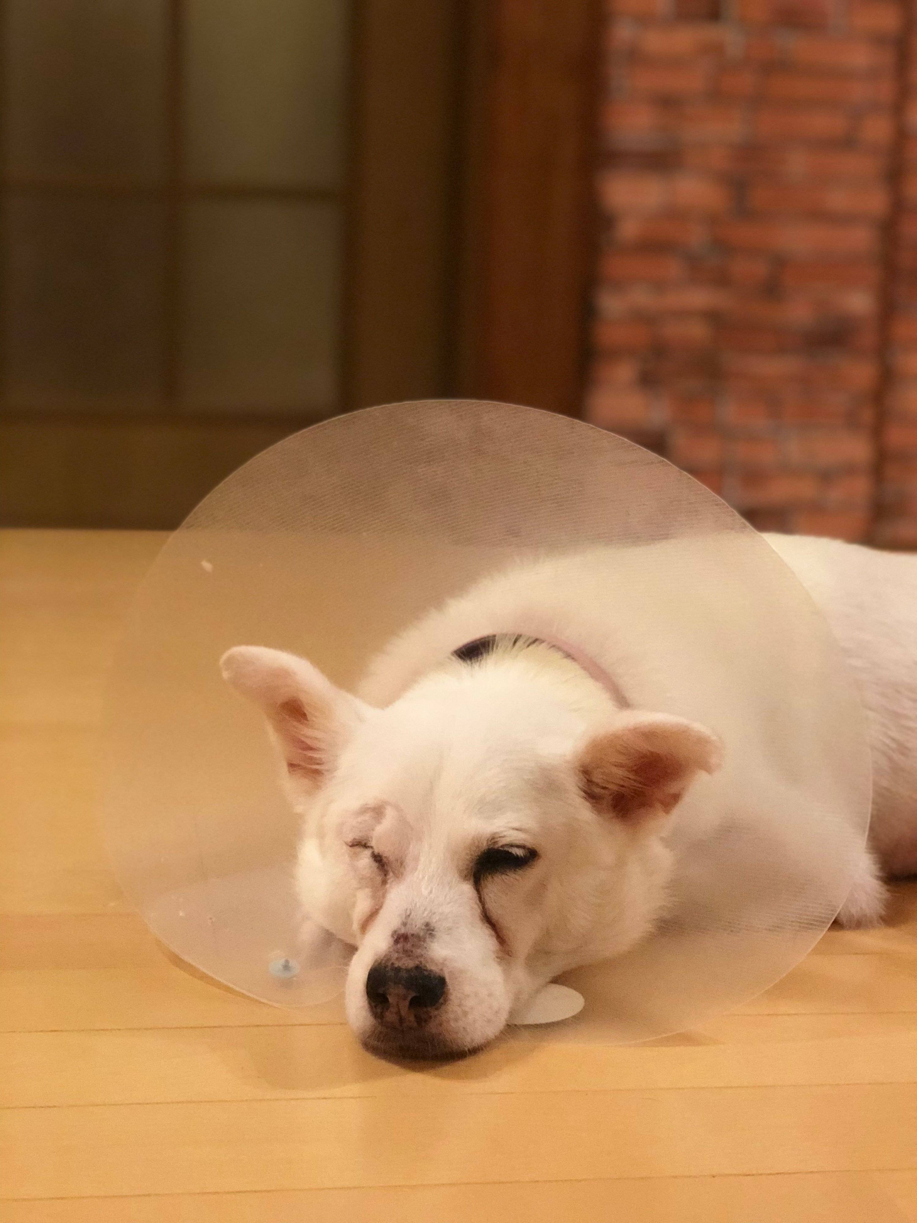 シロさんが失明してから数か月が過ぎ、緑内障は落ち着いていたものの、目の中に潰瘍ができてしまいました。