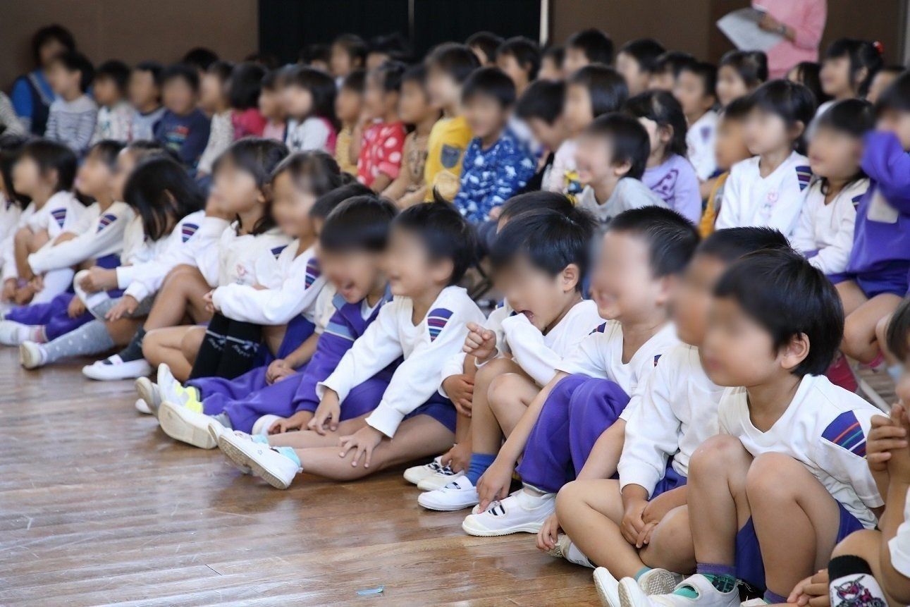 スクリーンに映し出されたおならをする犬の絵、ときどき聞こえてくるおならの効果音、そして抑揚ある朗読に、園児たちは夢中になって聞いていました。