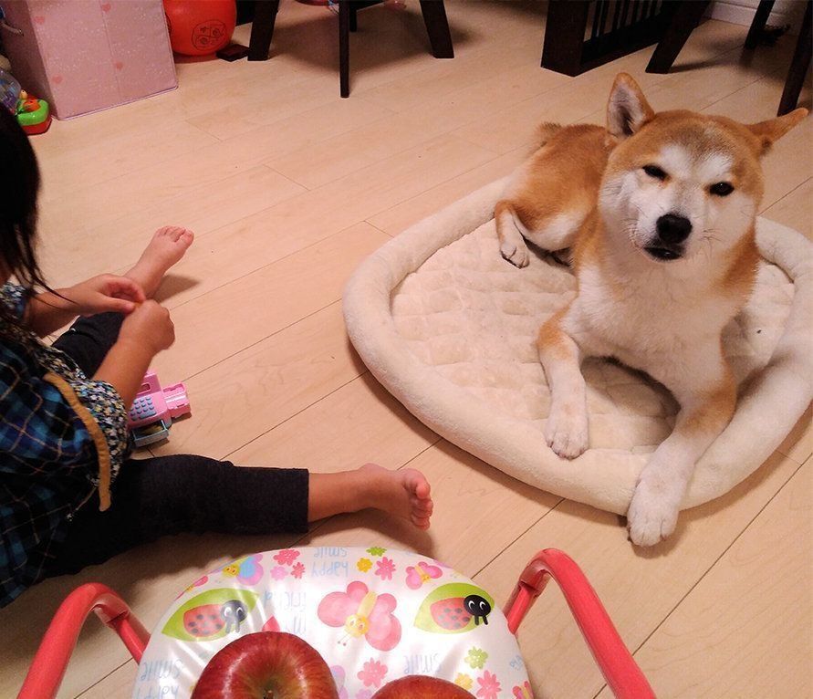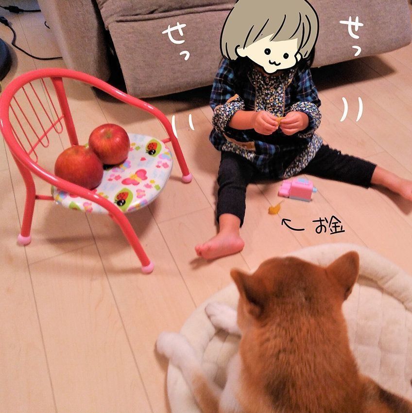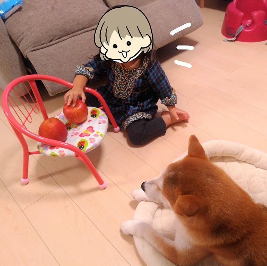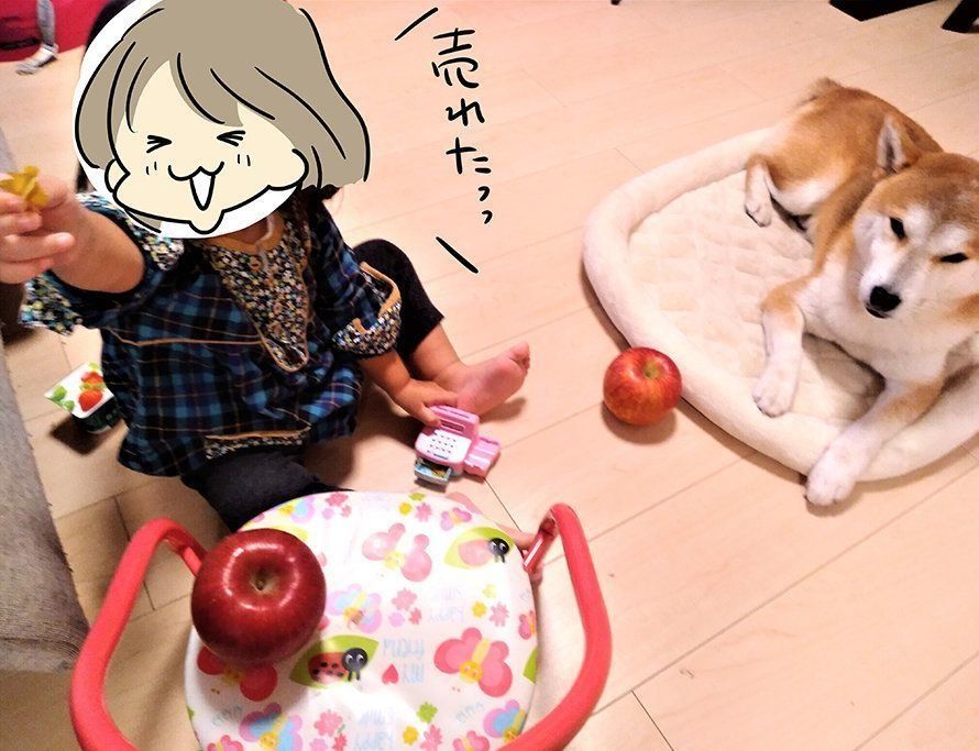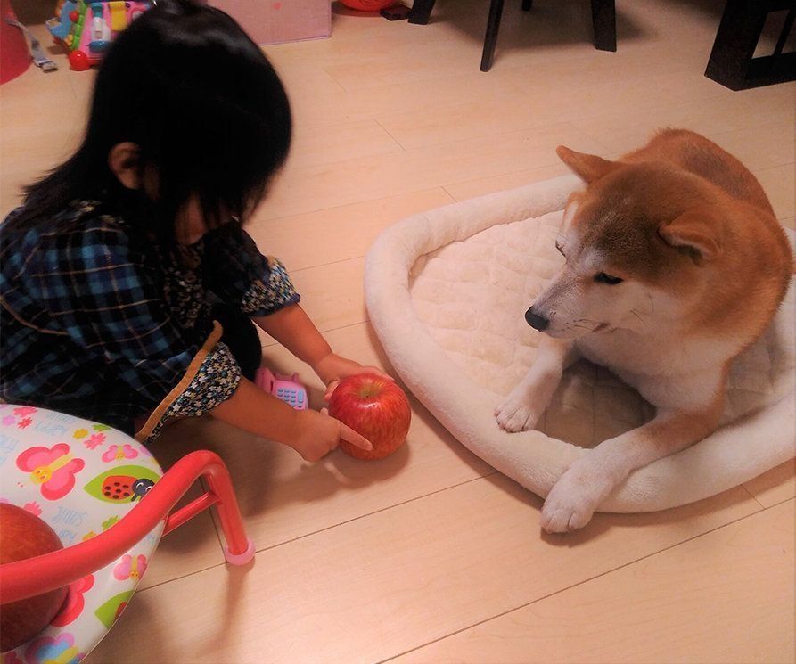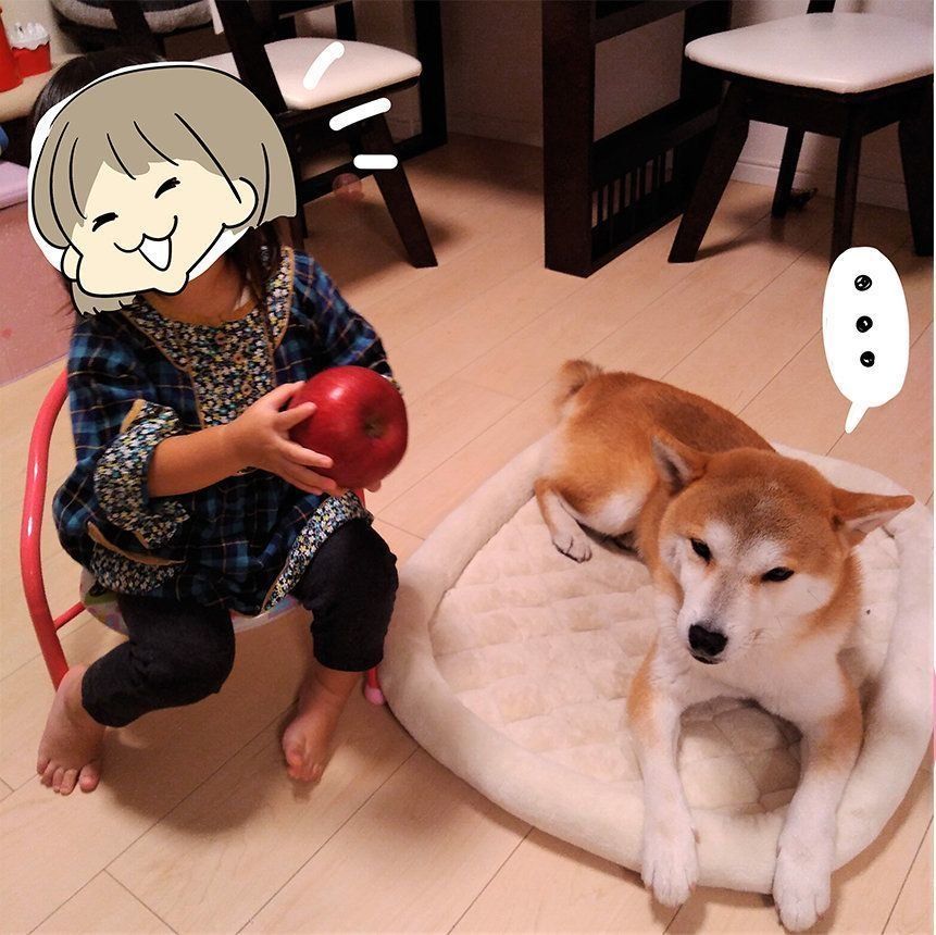 娘のリンゴ押し売に柴犬タロさんの顔が…|連載「モフモフ柴とプニプニ娘」第45話