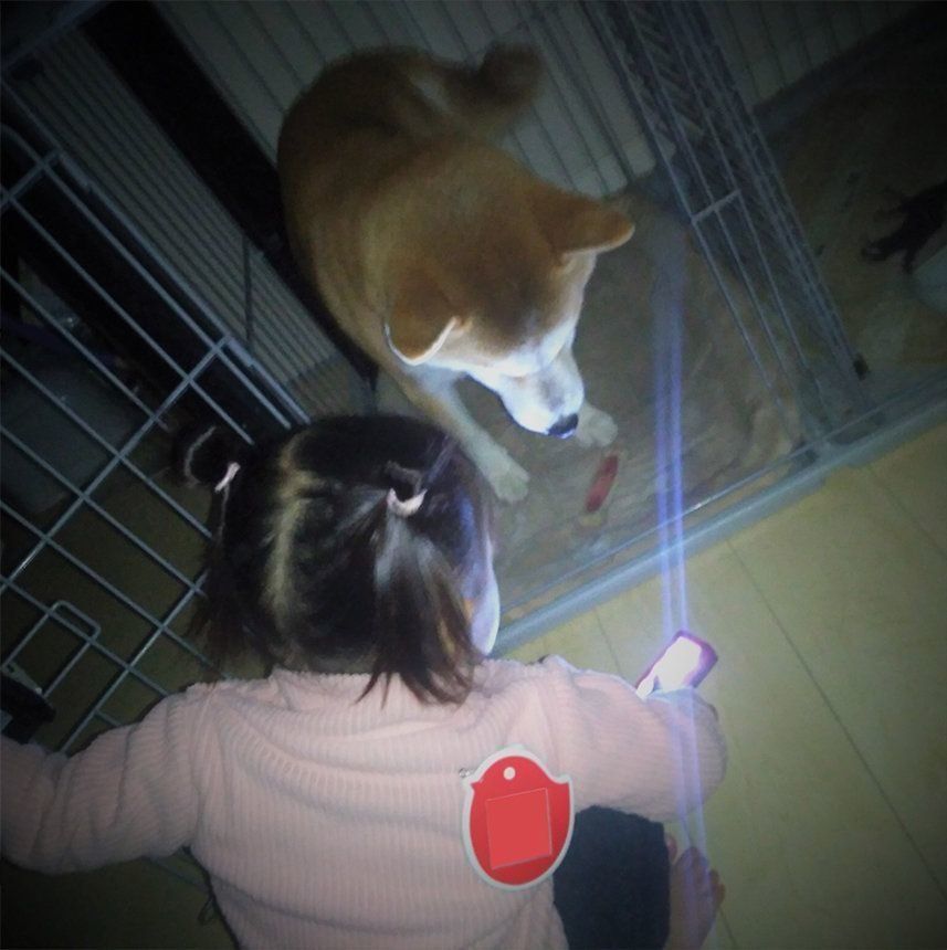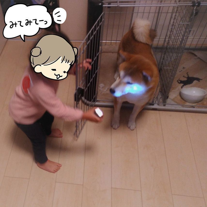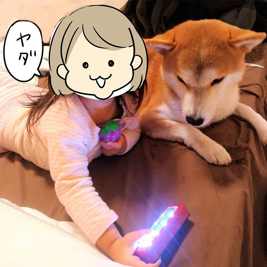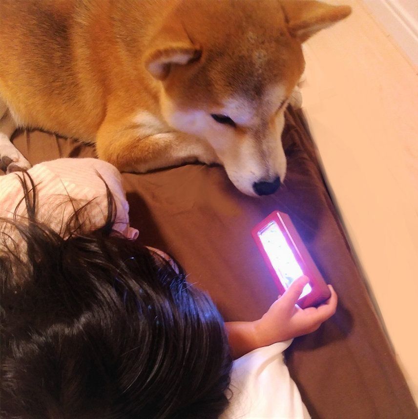 寝る時間になってもライトを持ち続ける娘。ライトをつけたり消したりしているだけなのですが、何がそんなに惹きつけるのか、タロさんも娘もずっと見ています。