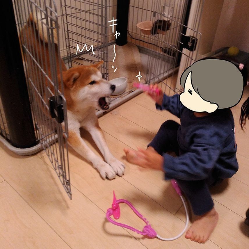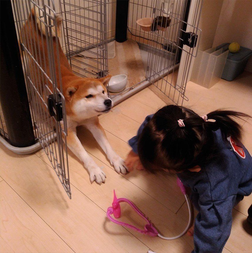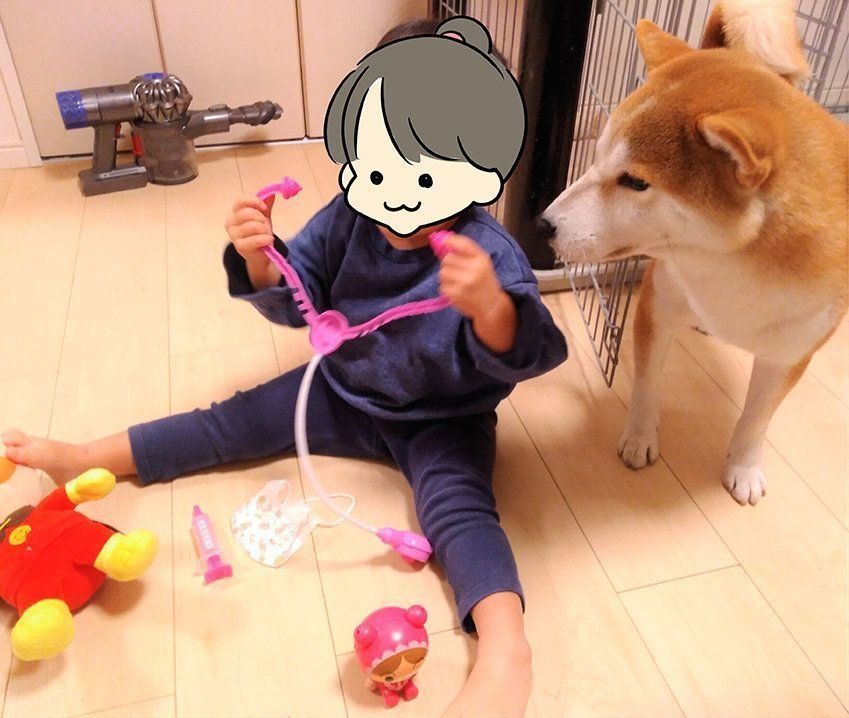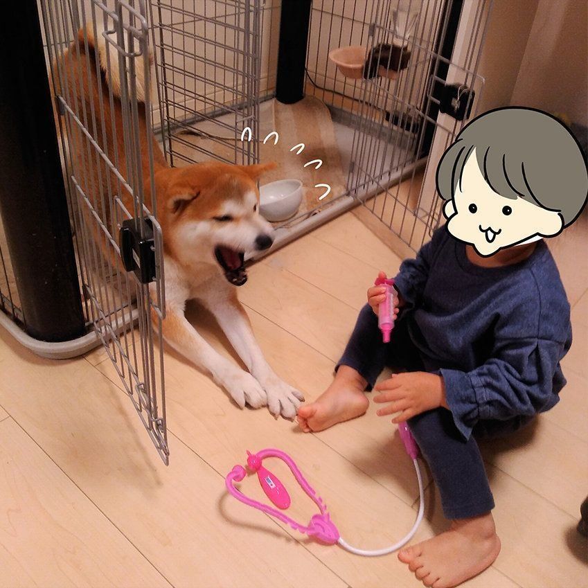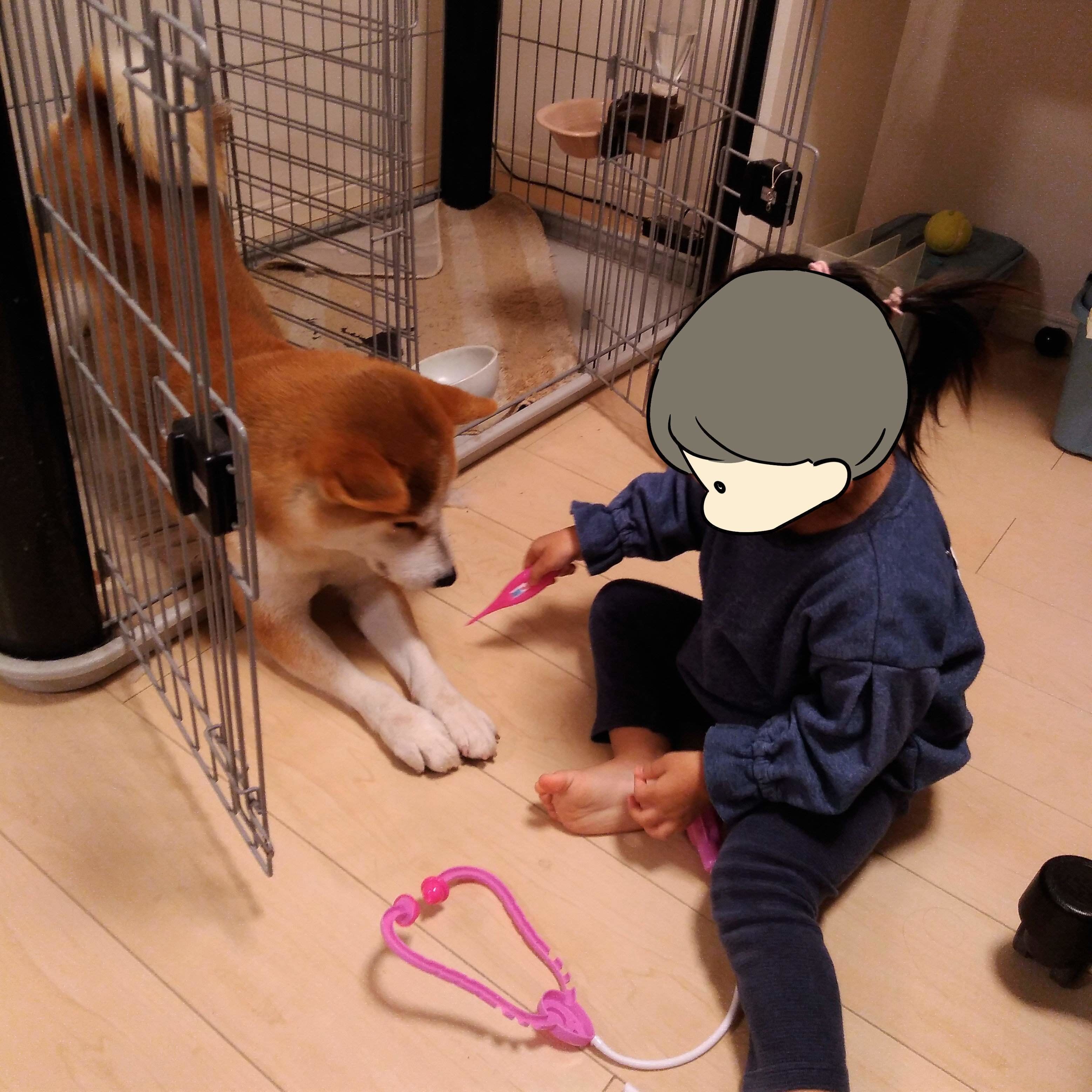 娘がお医者さんごっこをしています。タロさんも診てほしいのか近くにやってきました。