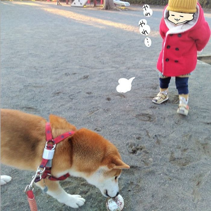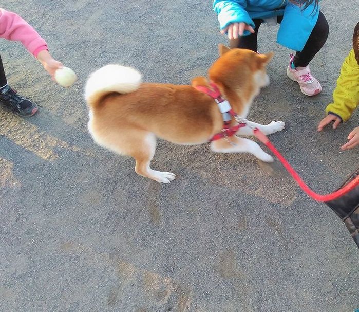 娘がもう帰るように言ってもボールで遊ぶタロさん。