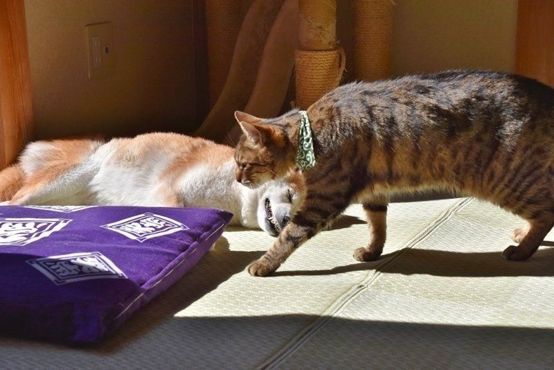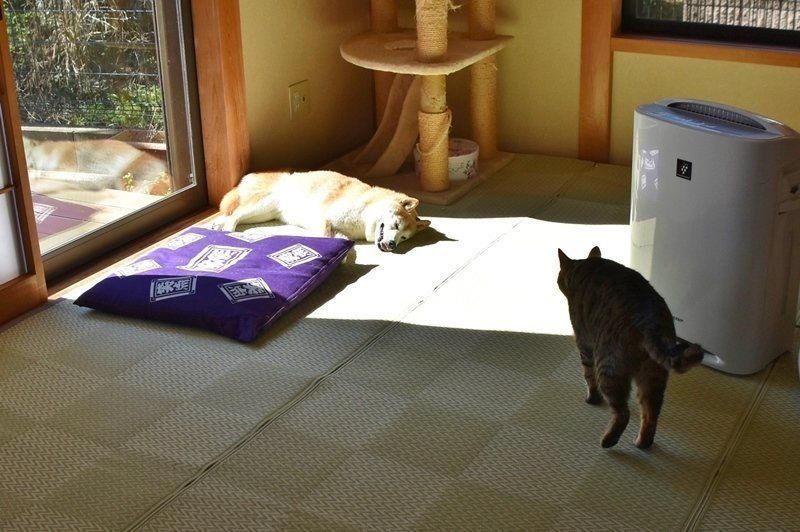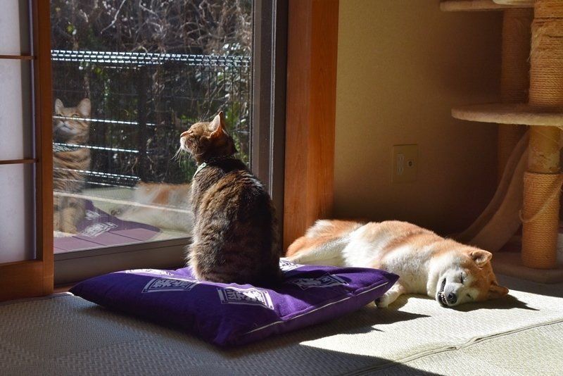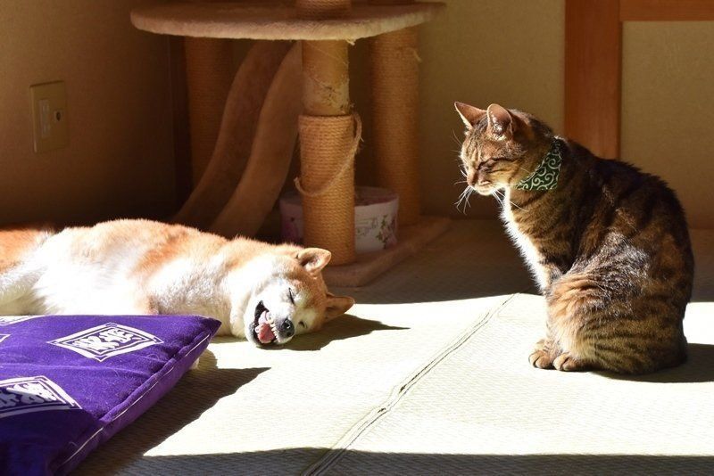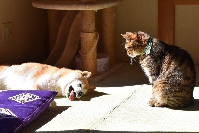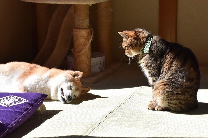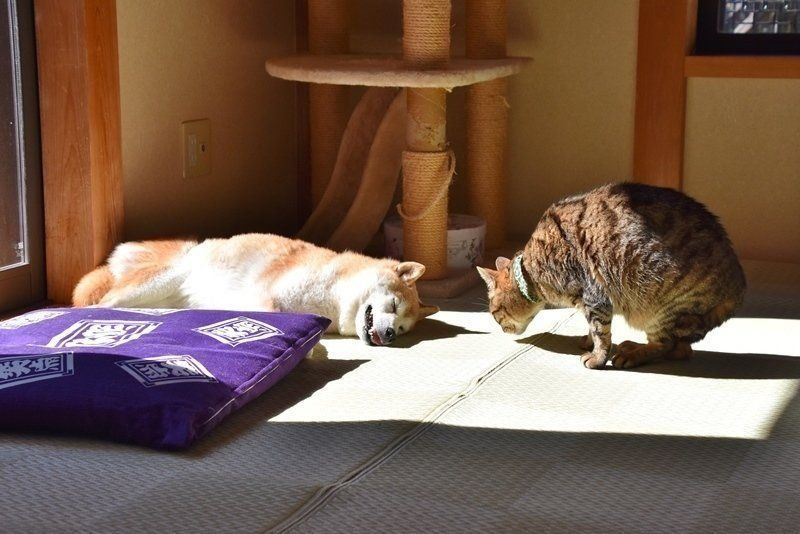 柴犬かぼすちゃんの激しい寝顔に、同居猫も戸惑いがち…