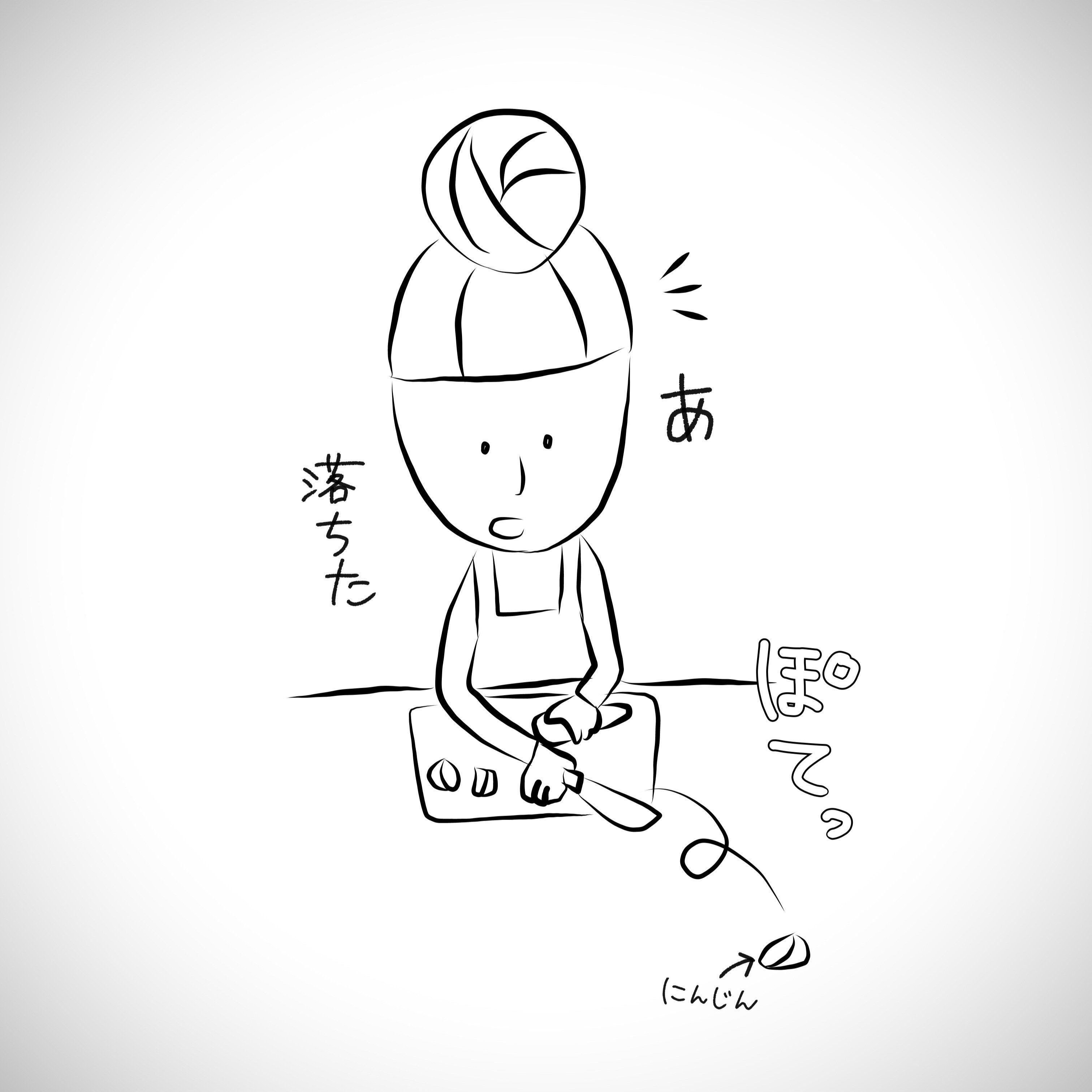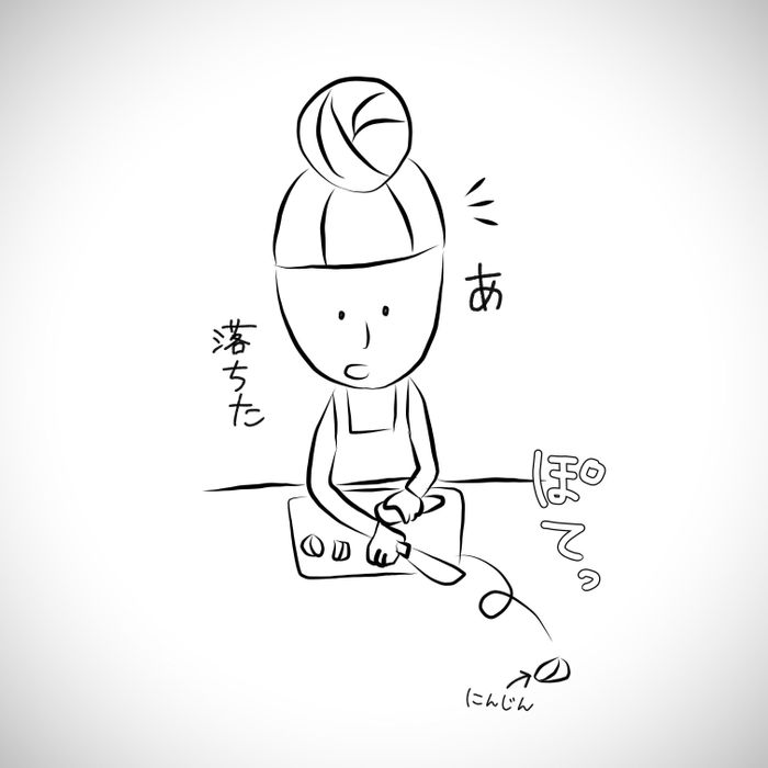 大きなブツ切りのにんじんがごろっと、床にダイブ。