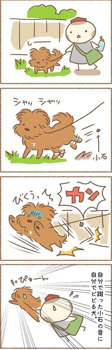 てんすけのビビリエピソードは色々ありますが(ただ歩いてるだけの亀にビビったり、かけてあるだけの上着にビビったり…)自分で放った小石にビビるとは(;´∀`)