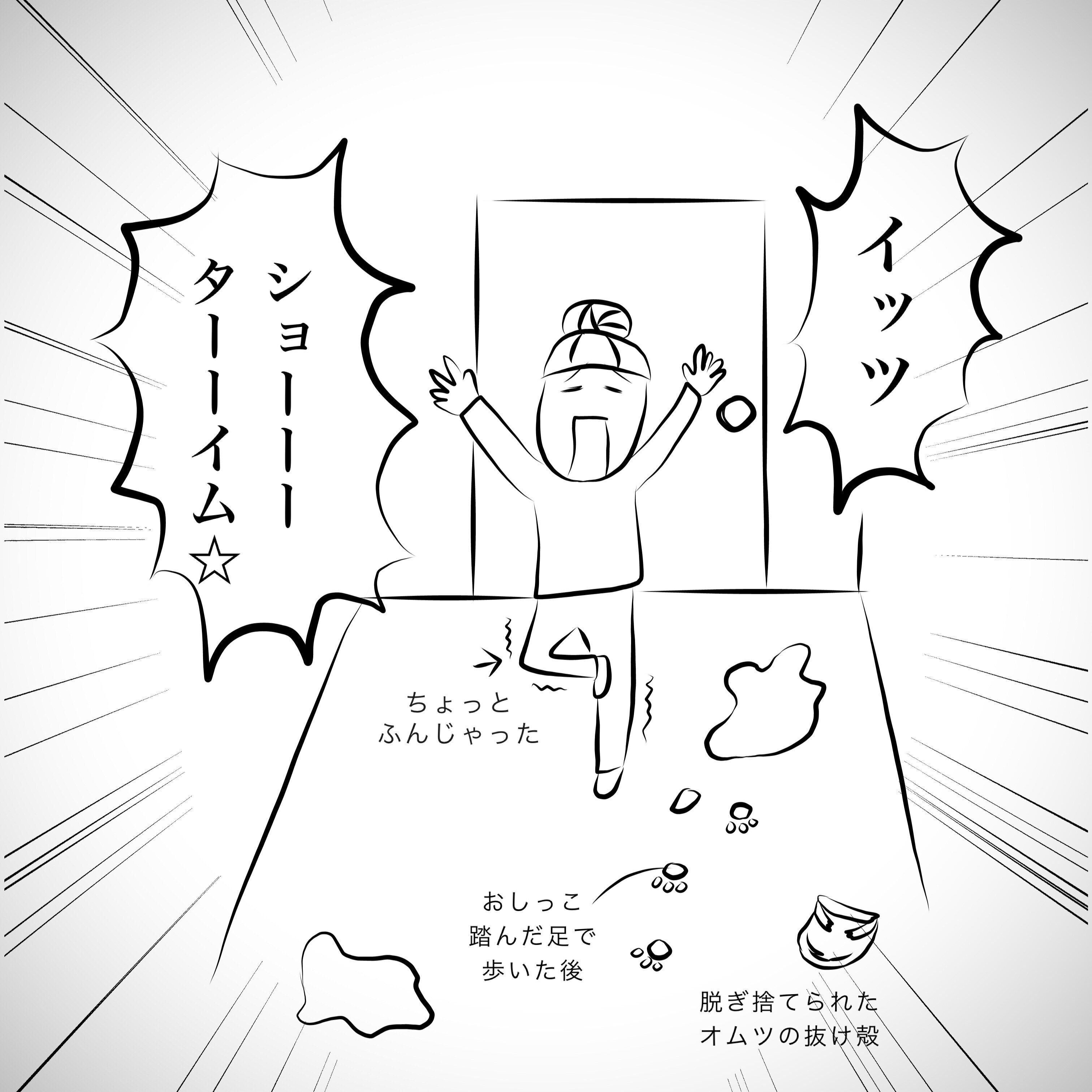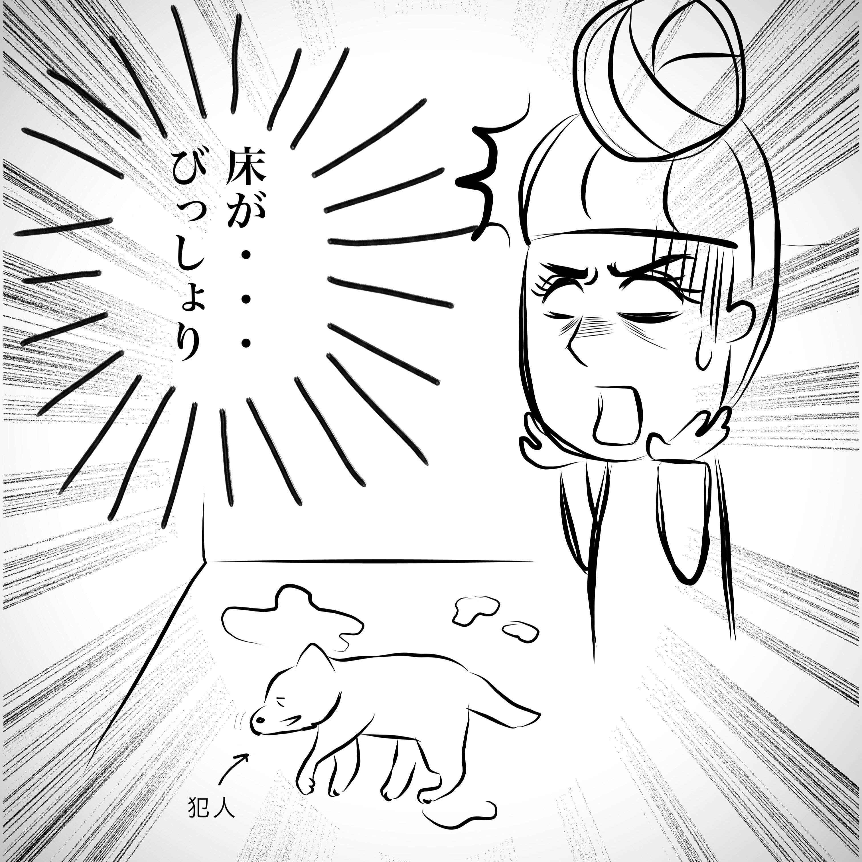 一面濡れたリビングの床、ヨボヨボと歩き回るおばあちゃん犬、