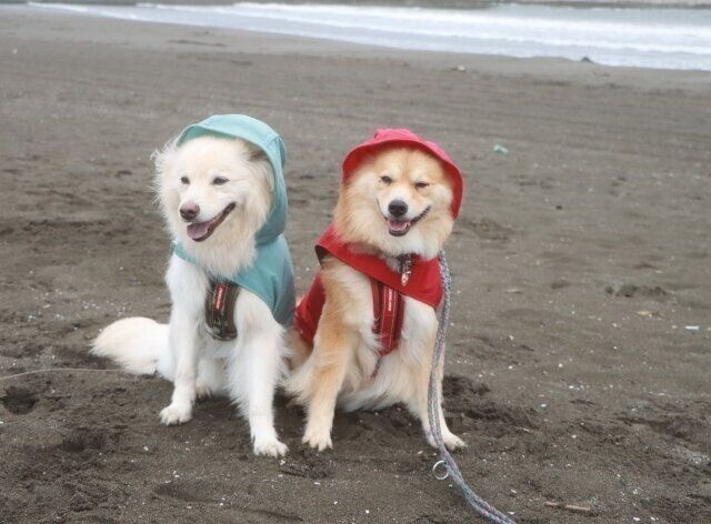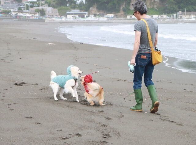 なすすべもなく、ずぶ濡れになっていく。それでも耐えながら歩いたが、大吉と福助にウンチをしそうなそぶりがない。そればかりか「こんな雨の中、なんで歩かなきゃいけないの?」と不満そうな顔をしている。しばらく様子を見たが全然しないので「帰ろうか」と言うと、2頭とも急ぎ足で家に向かう。