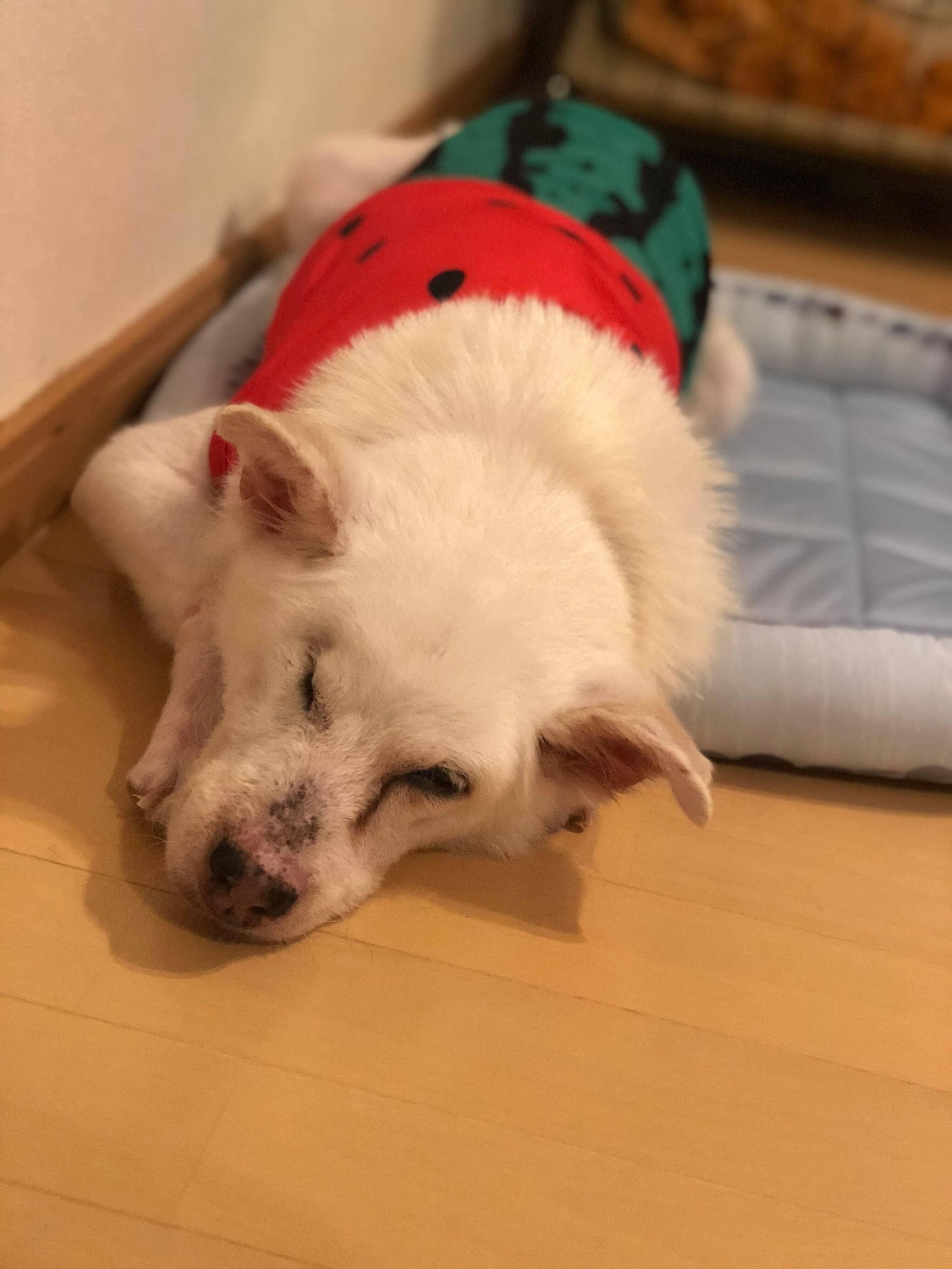 ”スイカ”の洋服を着たシロさんが尊すぎて…おかーさんの脳内オキシトシンが溢れちゃう!?【連載】おばあちゃん犬がやってきた 第81回