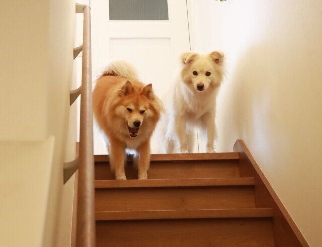 最近は、朝暑くなる前にと5時半ころに目覚ましをかけ、散歩に行く支度をして玄関から「お前ら、行くぞー!」と呼ぶのが日課になっている。そうすると、眠そうな顔でだるそうに2階の踊り場に福助、大吉の順で現れて、仕方ないなぁと階段を降りてくる。