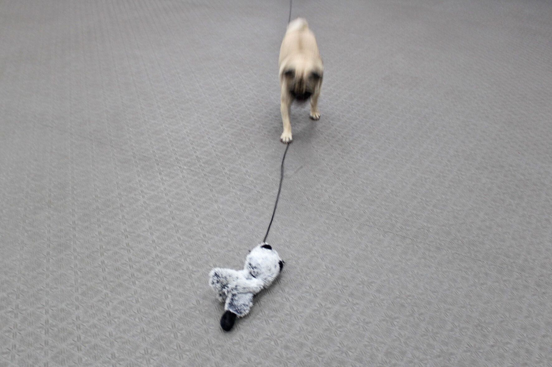 紐つきのおもちゃを右に左に上手に動かせる年齢ならば、おもちゃに1.5〜2mぐらいの紐をつけ、それを犬に追いかけさせる遊び(追いかけ遊び)も可能です。
