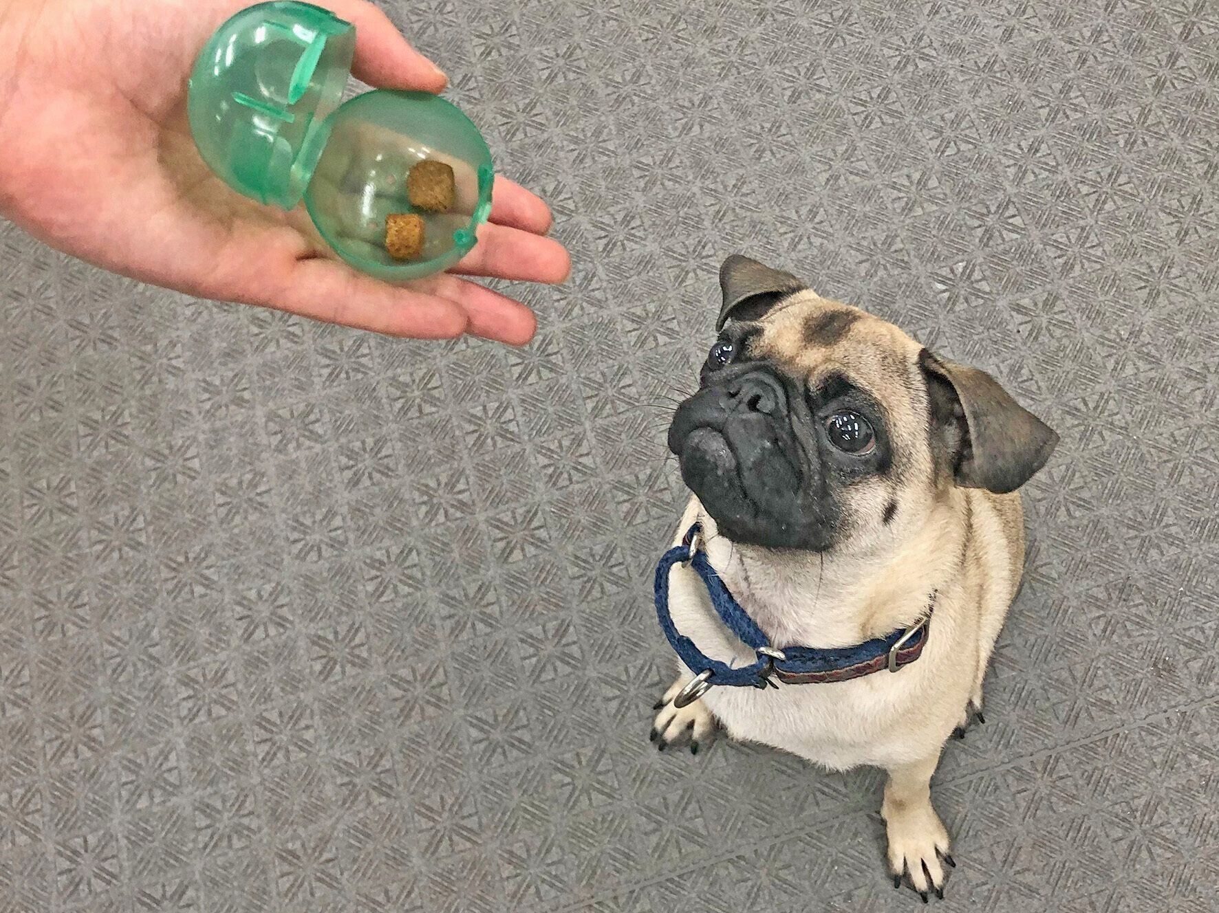 カプセルにフードを入れるところを犬に見せ、匂いを嗅がせます。