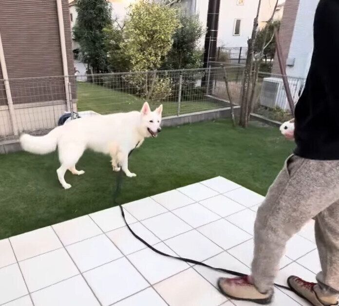 パパとお庭で遊ぶホワイトシェパードのれおくん。ボールキャッチには興味がなく、パパが投げたボールが落ちるのを見ているだけでしたが……だんだん楽しくなってきたのかキャッチしようとするように! 最後はお口でしっかりキャッチできました。動画です。