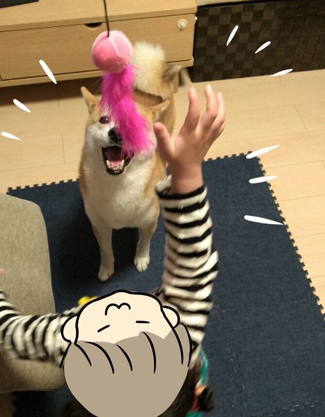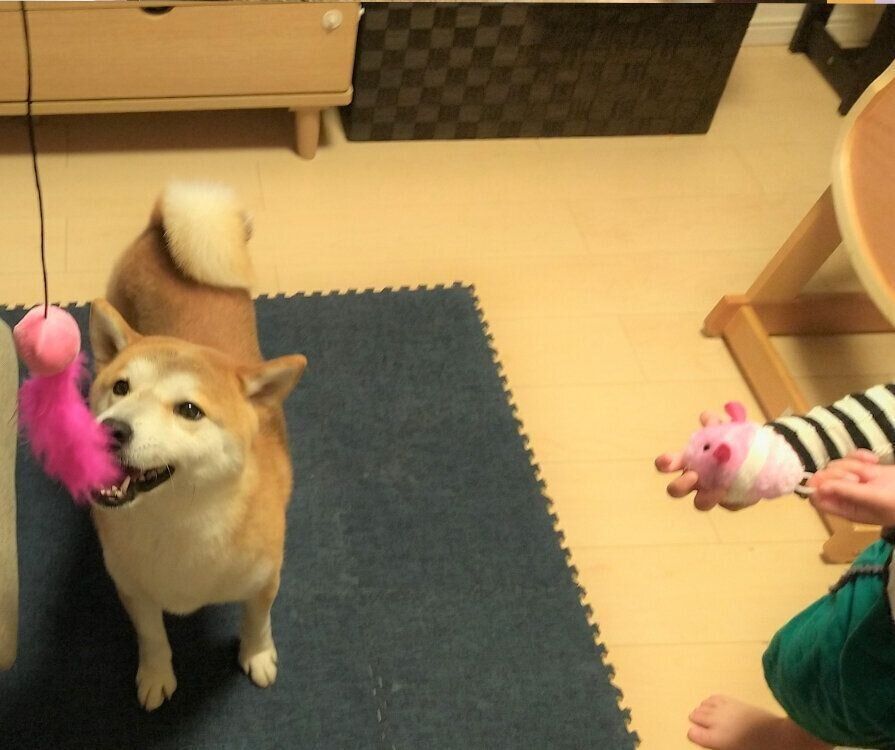 猫なら室内でこれくらい遊んでもいいと思いますが、タロさんサイズの犬と娘が猫じゃらしで遊ぶと、室内は大騒ぎに…