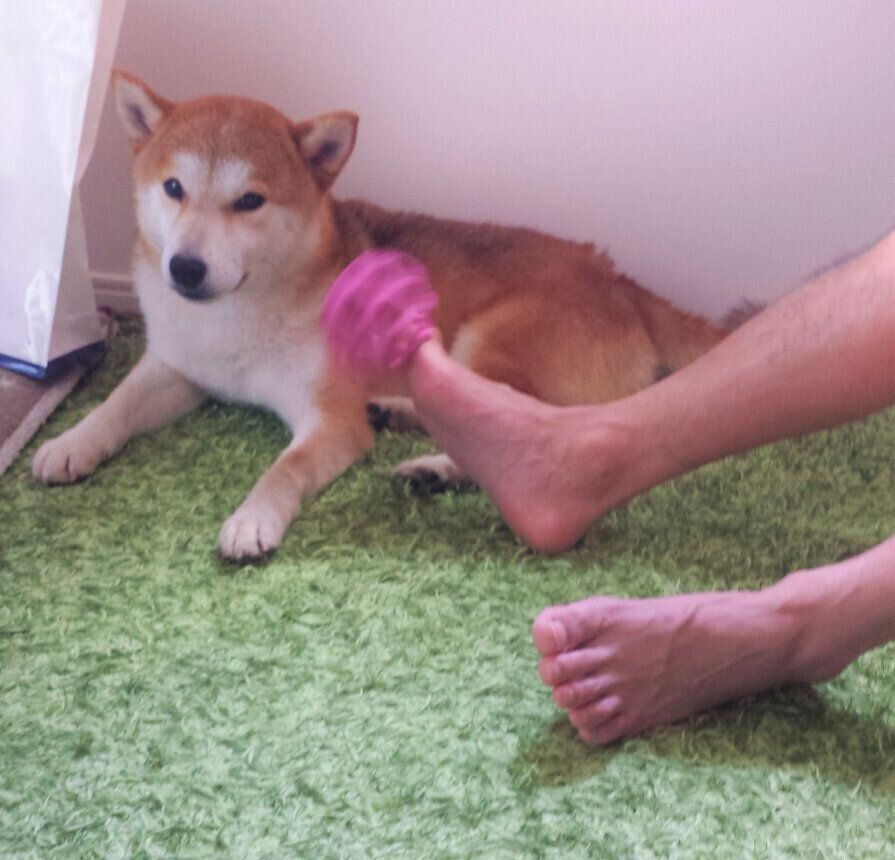 猫じゃらしに猫パンチならぬ、柴パンチをしています。