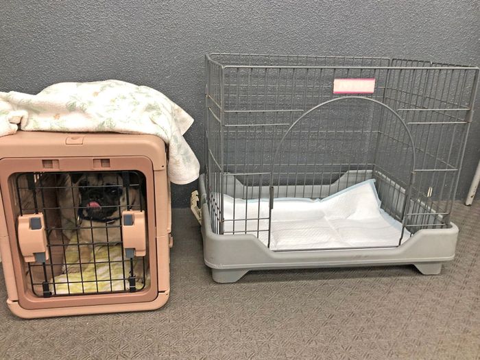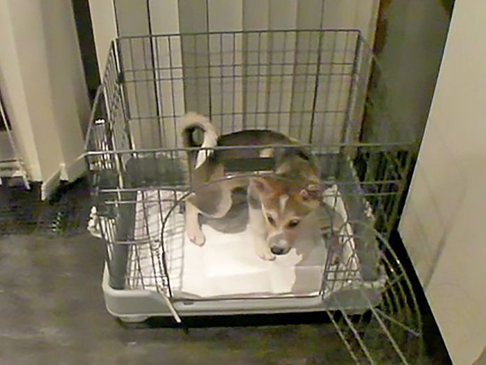 犬がオシッコをガマンできる時間(犬の月齢+1時間)ごとに、犬をクレートから出してトイレに連れて行きます。