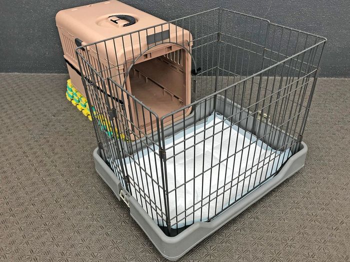 どんな方法かを再度簡単にご説明すると、クレート(プラスチック製のキャリーケース)とサークルを用意し、サークル内にトイレシーツを敷き詰めます。