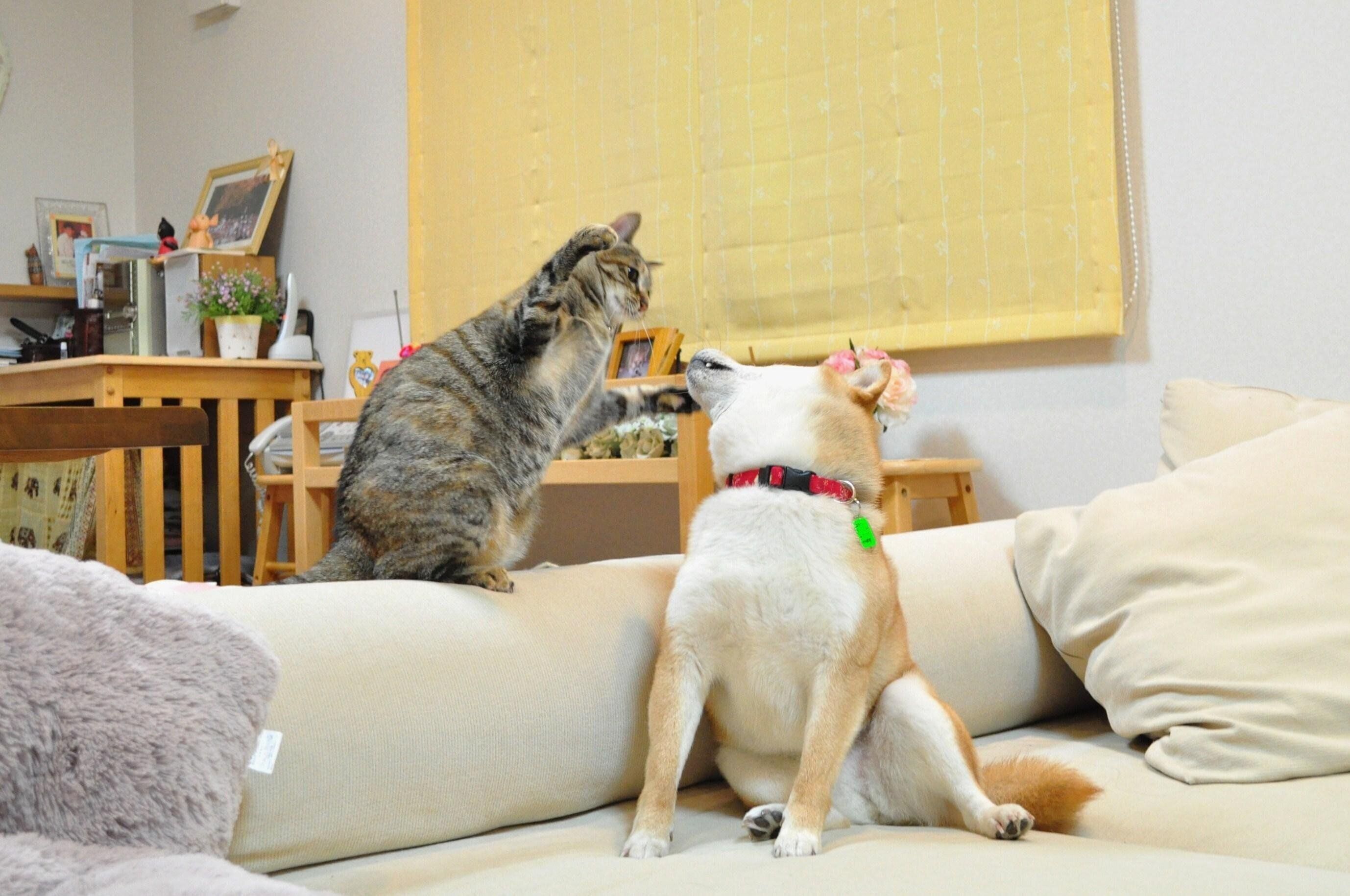 おっと出ました、猫パンチ!!かぼちゃんに、ニャンプロレスの相手をして欲しいみたいです。