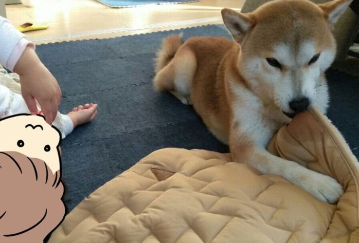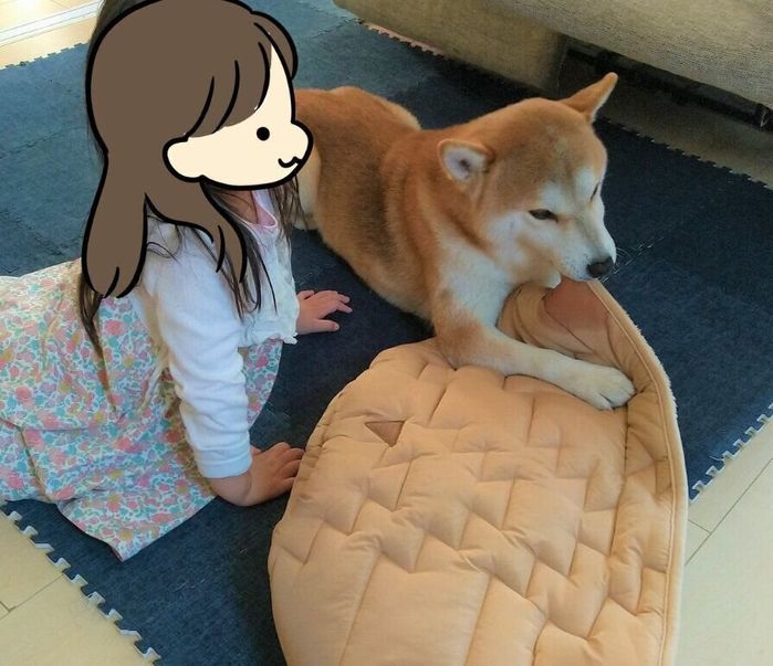 なんとか元の形に戻そうとしていると、娘もタロさんのベットが気になって近づいてきました。
