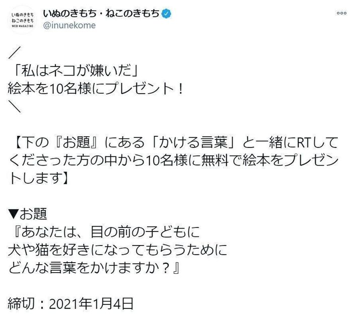 そんな中、いぬねこ絵本部では2020年12月14日~2021年1月4日まで、Twitterキャンペーンを実施し、約20名の方にご参加いただきました。