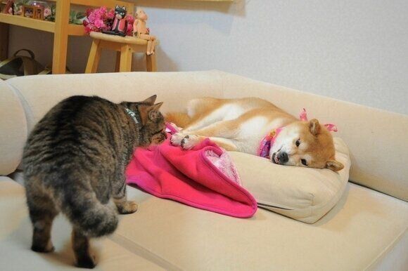 掃除機の音に驚き、先住ハスキーの後ろへ隠れたコーギー子犬。お迎えから9カ月、生後11カ月になった今では、大きい音が苦手な時に駆け寄ったり、兄犬に「一緒に遊ぼう」と誘われたり。3頭の関係の変化を飼い主さんに取材しました。