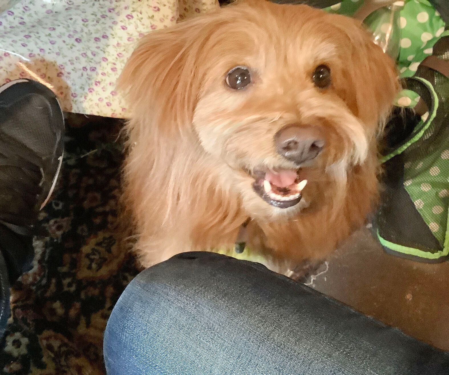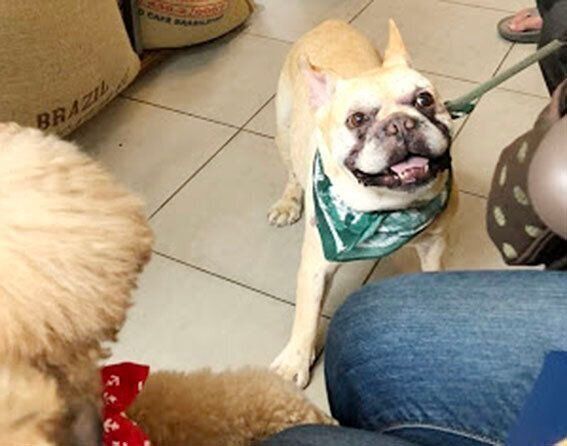 フレブルちゃんと暮らしている犬友さんと並んで話している時に、てんすけがピョーンとジャンプして、私の膝の上に飛び乗ってきました。