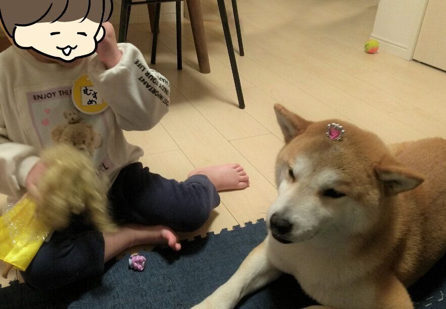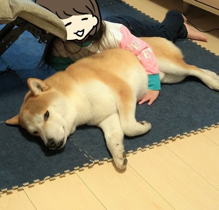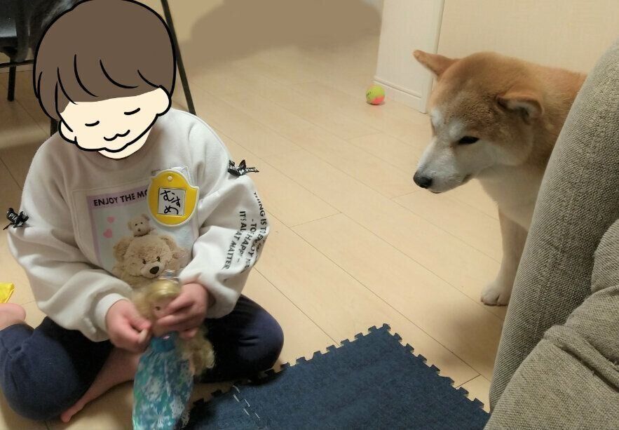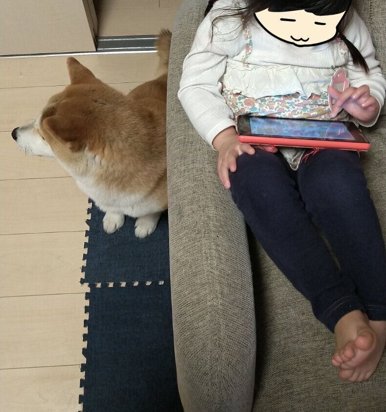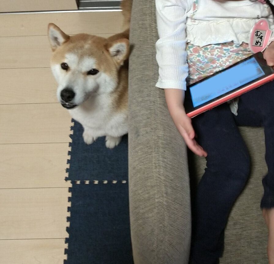 娘が遊んでいるとゆっくりと近づくタロさん。なんだか獲物を狙っているような顔をしていますが、これは甘えに行っているタロさんです…
