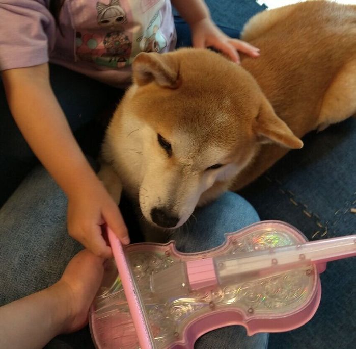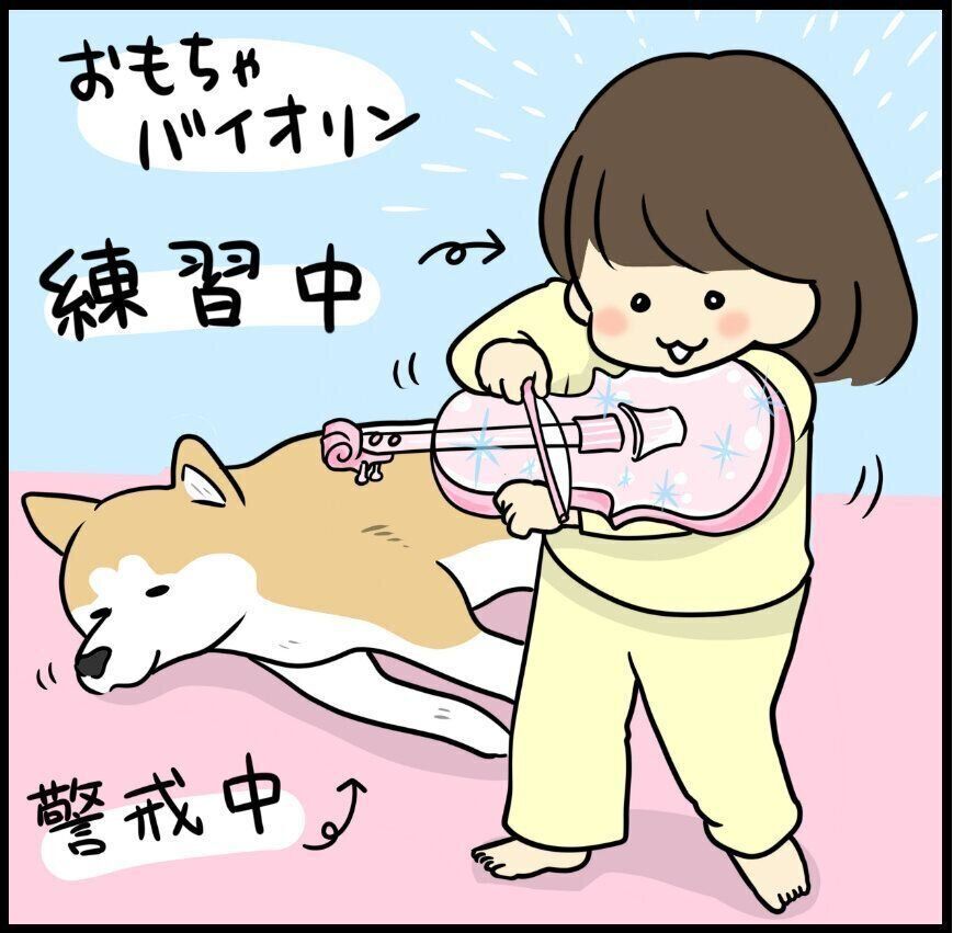 娘がバイオリンで遊んでいる近くで寝ているかと思いきや、実はバイオリンをガン見しているタロさん…