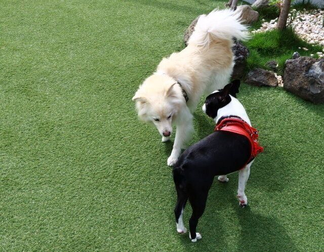 小型犬エリアと、中型・大型犬エリアに分かれているので小さい犬でも大丈夫。ドッグランは人工芝になっているので、雨が降っても犬の足がドロドロになる心配はない。
